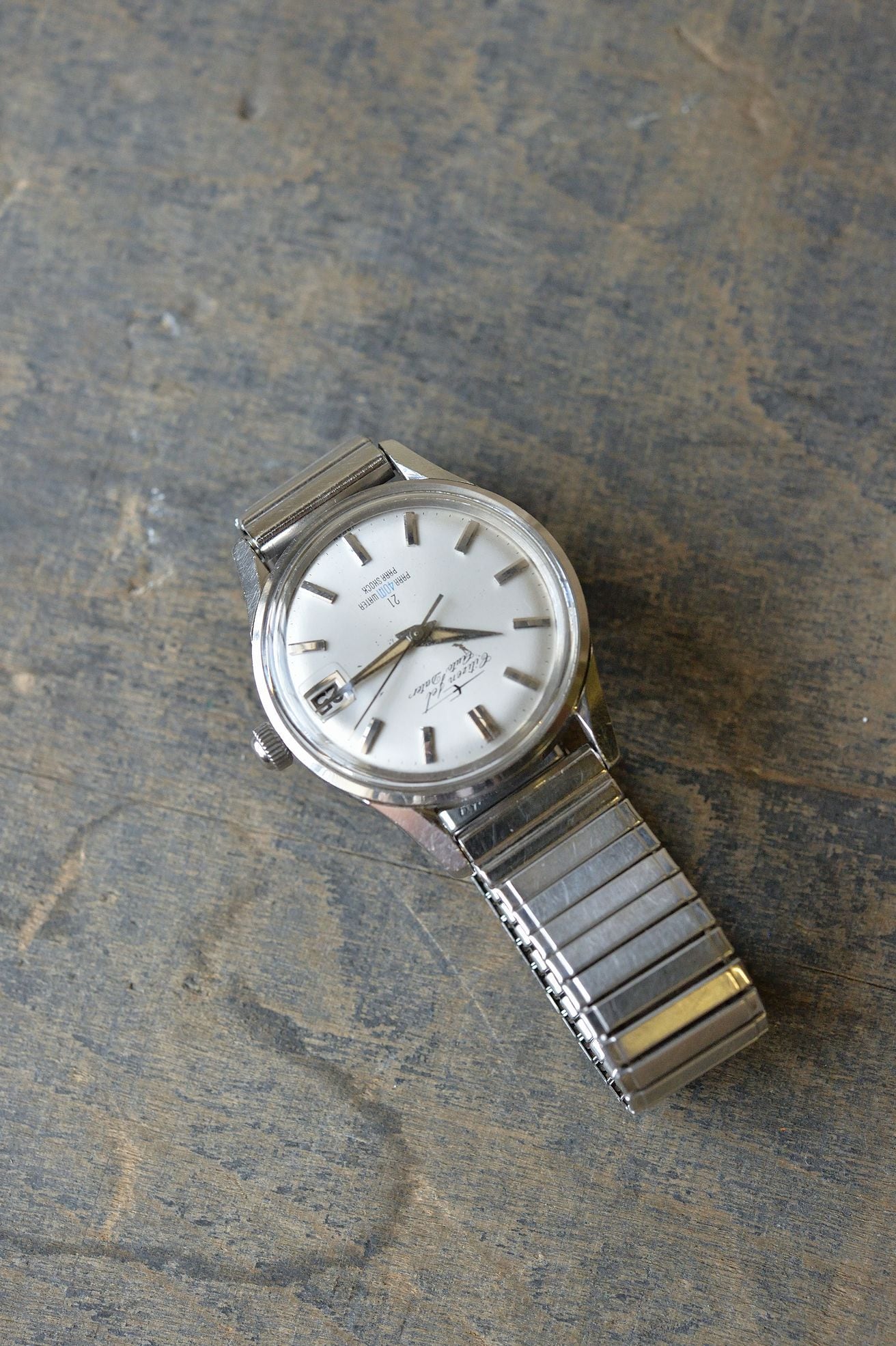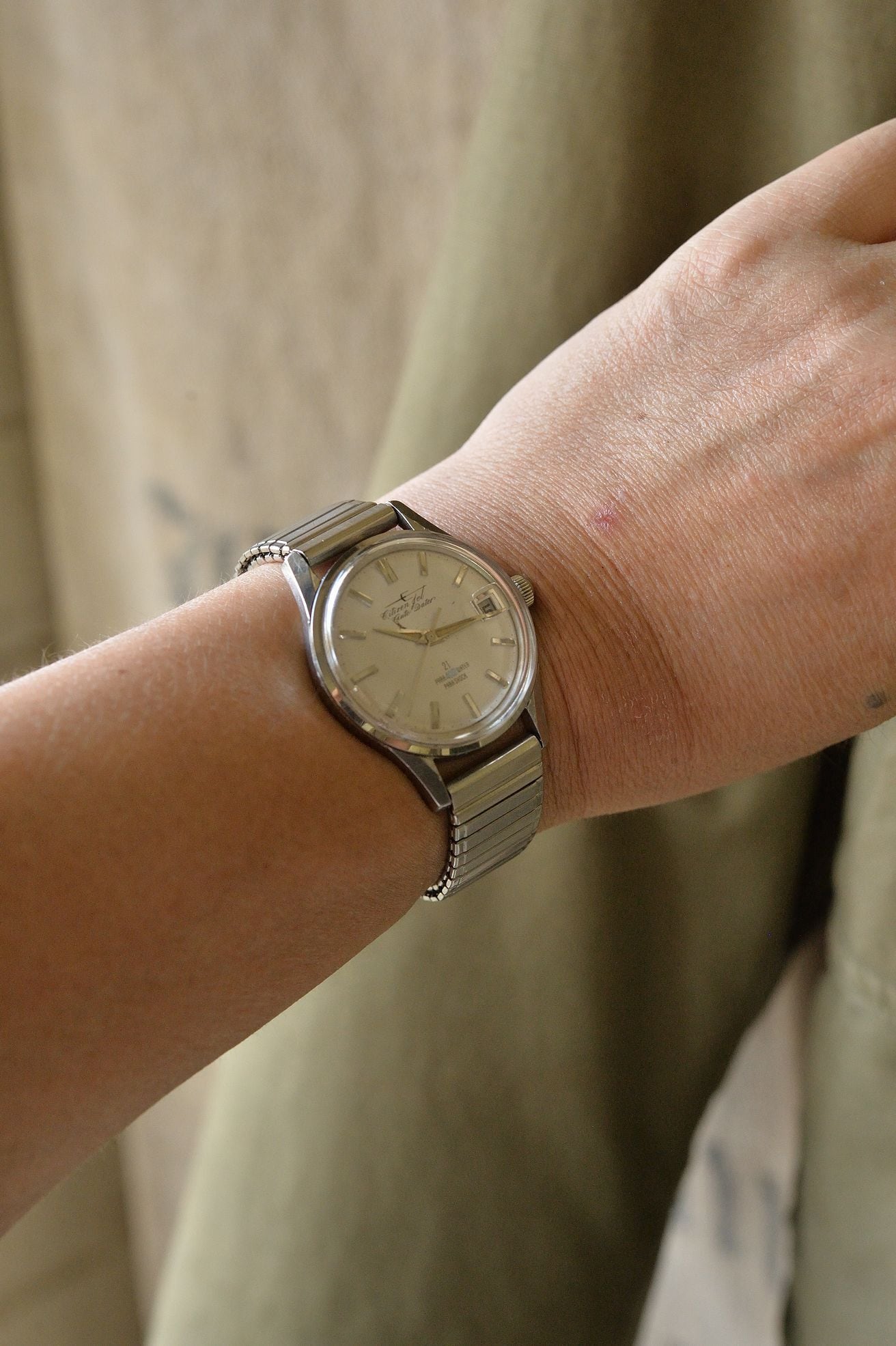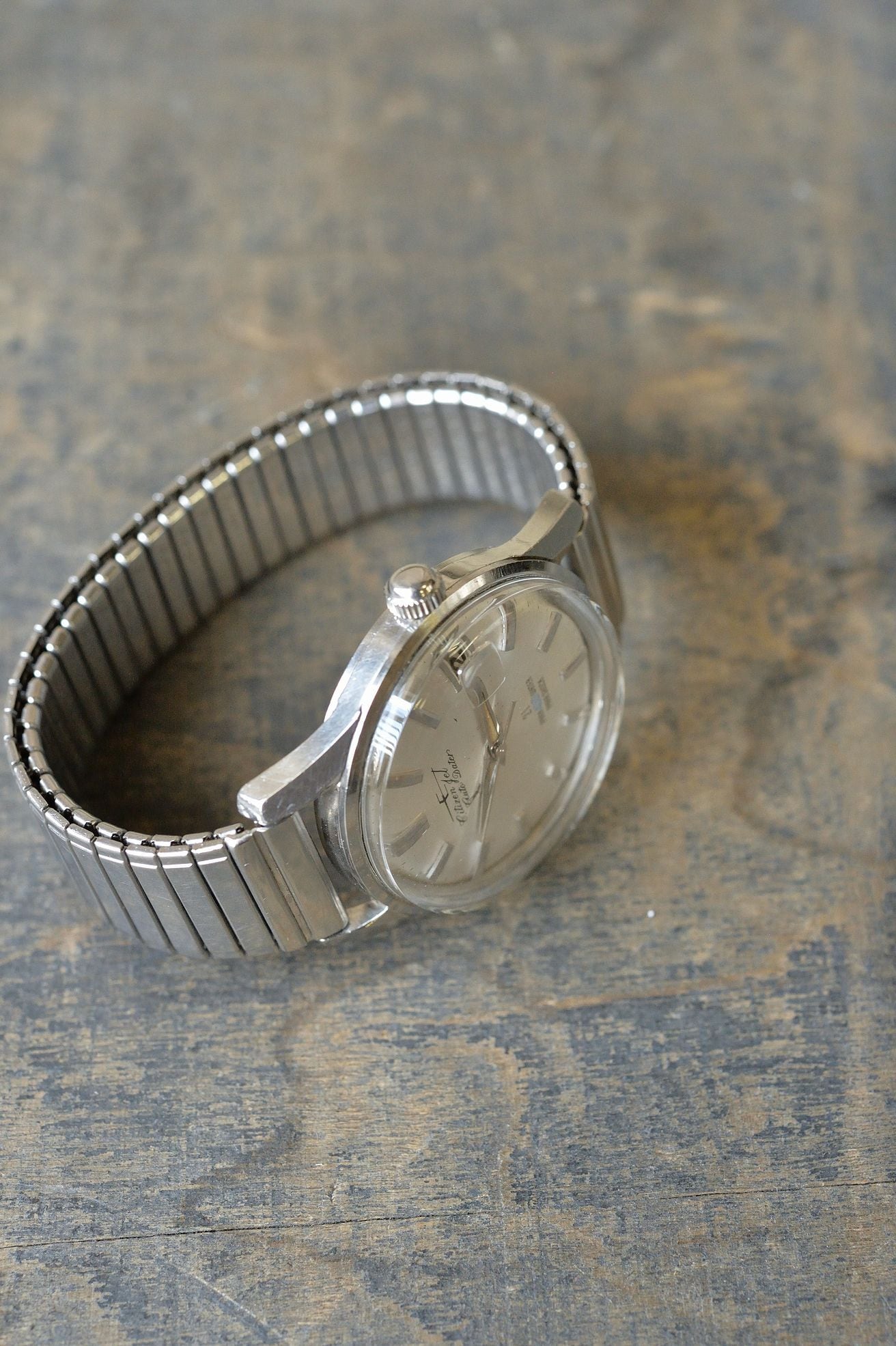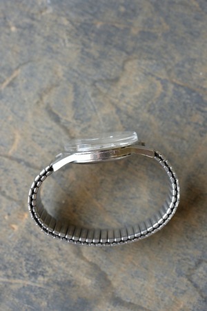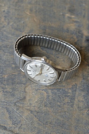 このブレスレットは1960年代の日本製のエクステンションステンレスブレスレットです。伸縮性に優れたブレスレットで、この時計本体とも時代的にマッチングのよいものです。