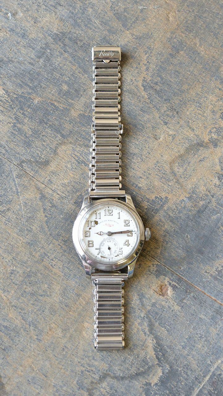 ブレスレットはイギリス製ボンクリップのバンブーブレス、1940年代製です。コンディションはニューオールドストックでありステンレススティール製、取付幅は16mm、本体幅13mm、筆記体ロゴの初期タイプになります。