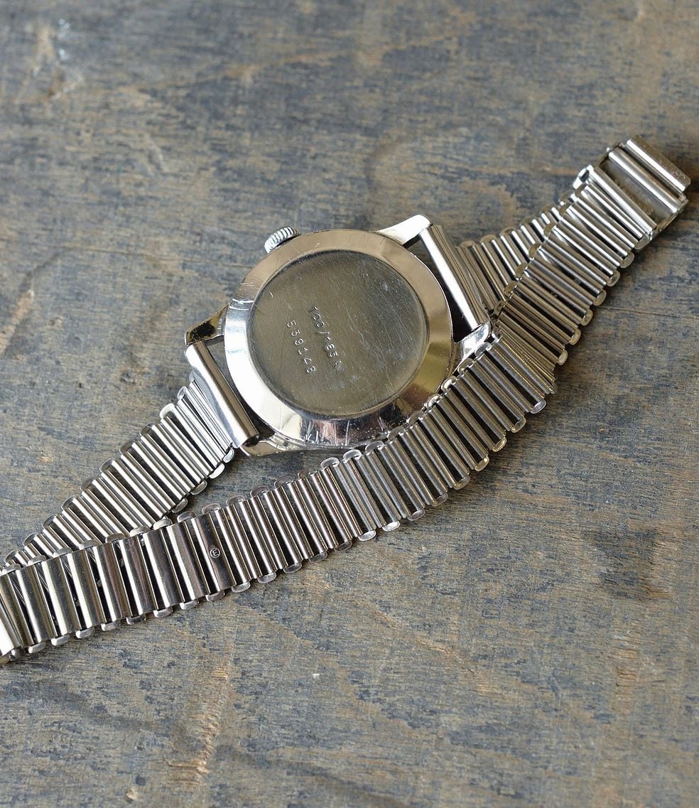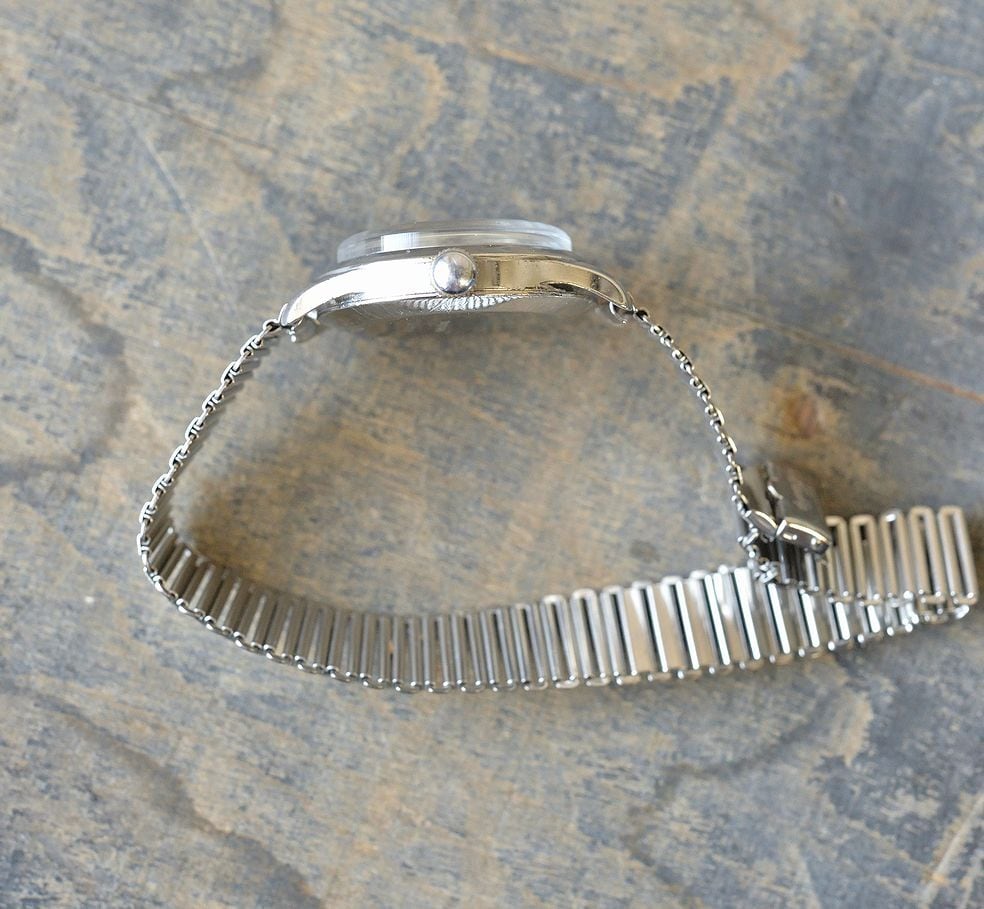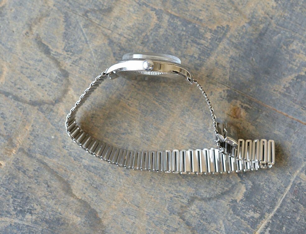 リューズ、およびムーブメントを交換した個体です。リューズは純正品ではありません。形状の似た形のものを取り付けています。ムーブメントはENICAR製のオールドムーブメントを搭載しています。
