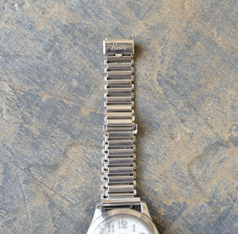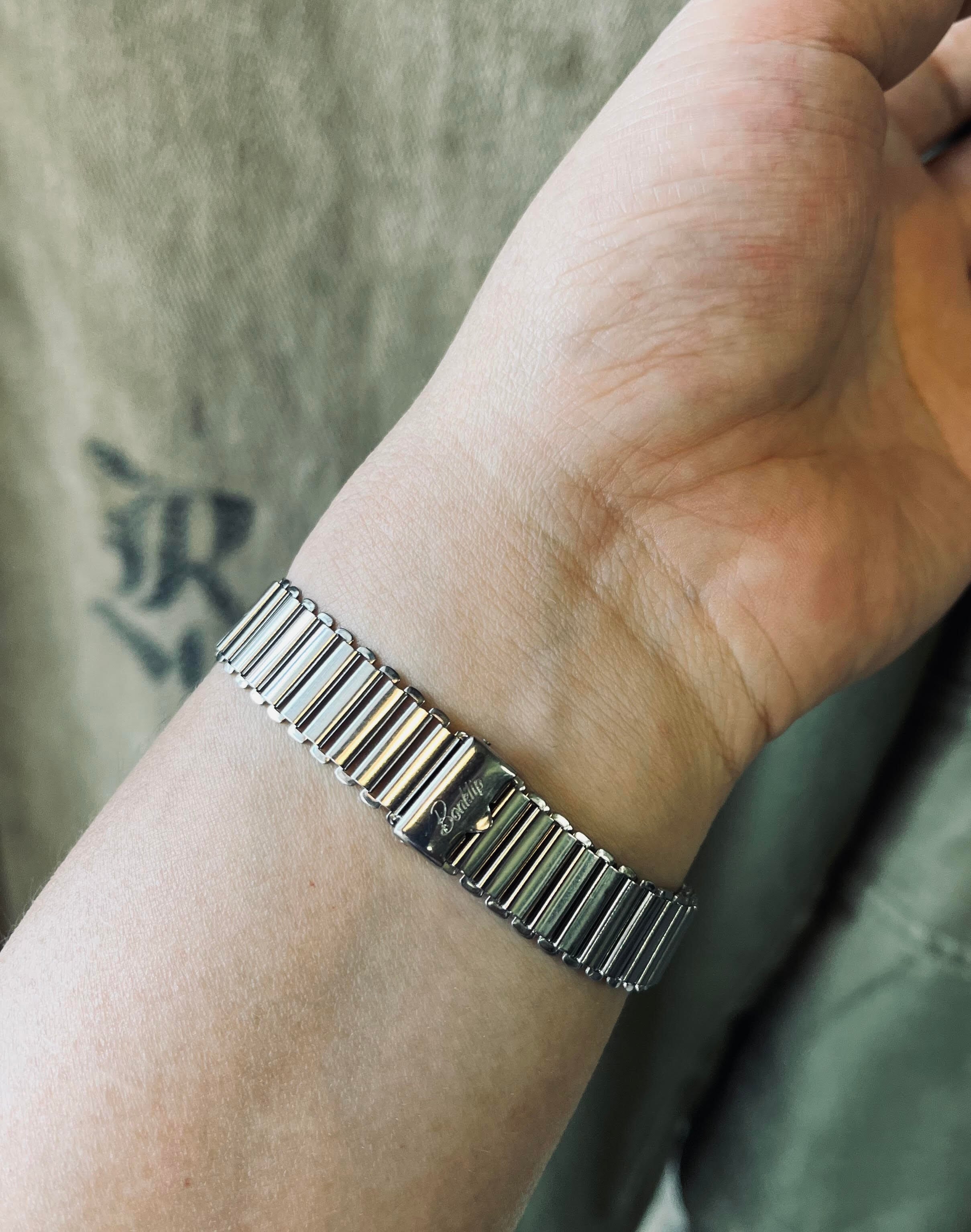 The bracelet is a British-made Bonclip bamboo bracelet from the 1940s. It is in new old stock condition, made of stainless steel with a 16mm mounting width, a 13mm body width, and an early style with a cursive logo.