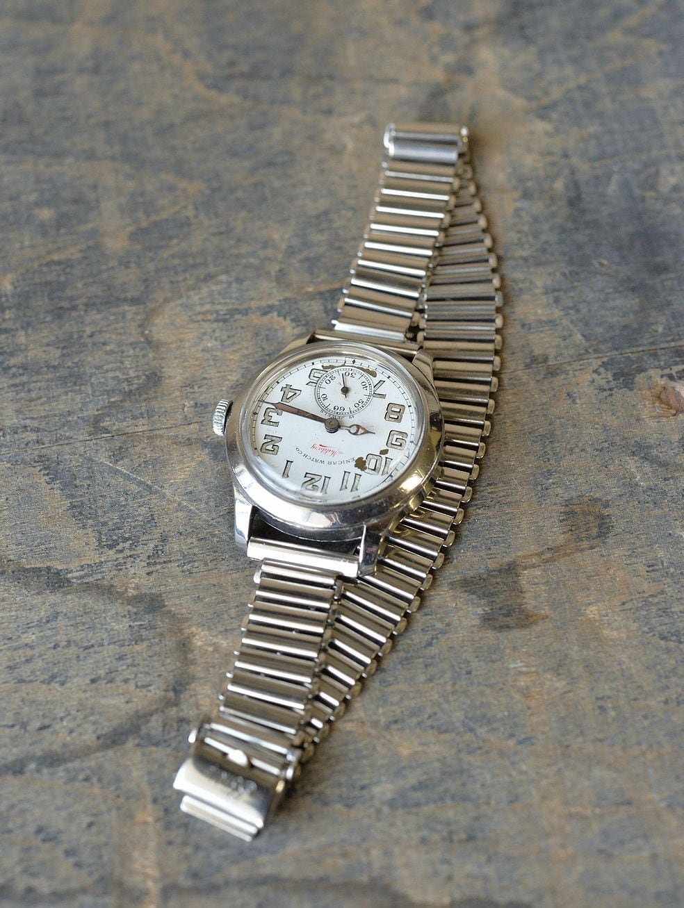 The hands are cobra-shaped, and the luminous coating is peeling. The watch also features a small seconds dial and blued steel hands, evoking the atmosphere of the period.