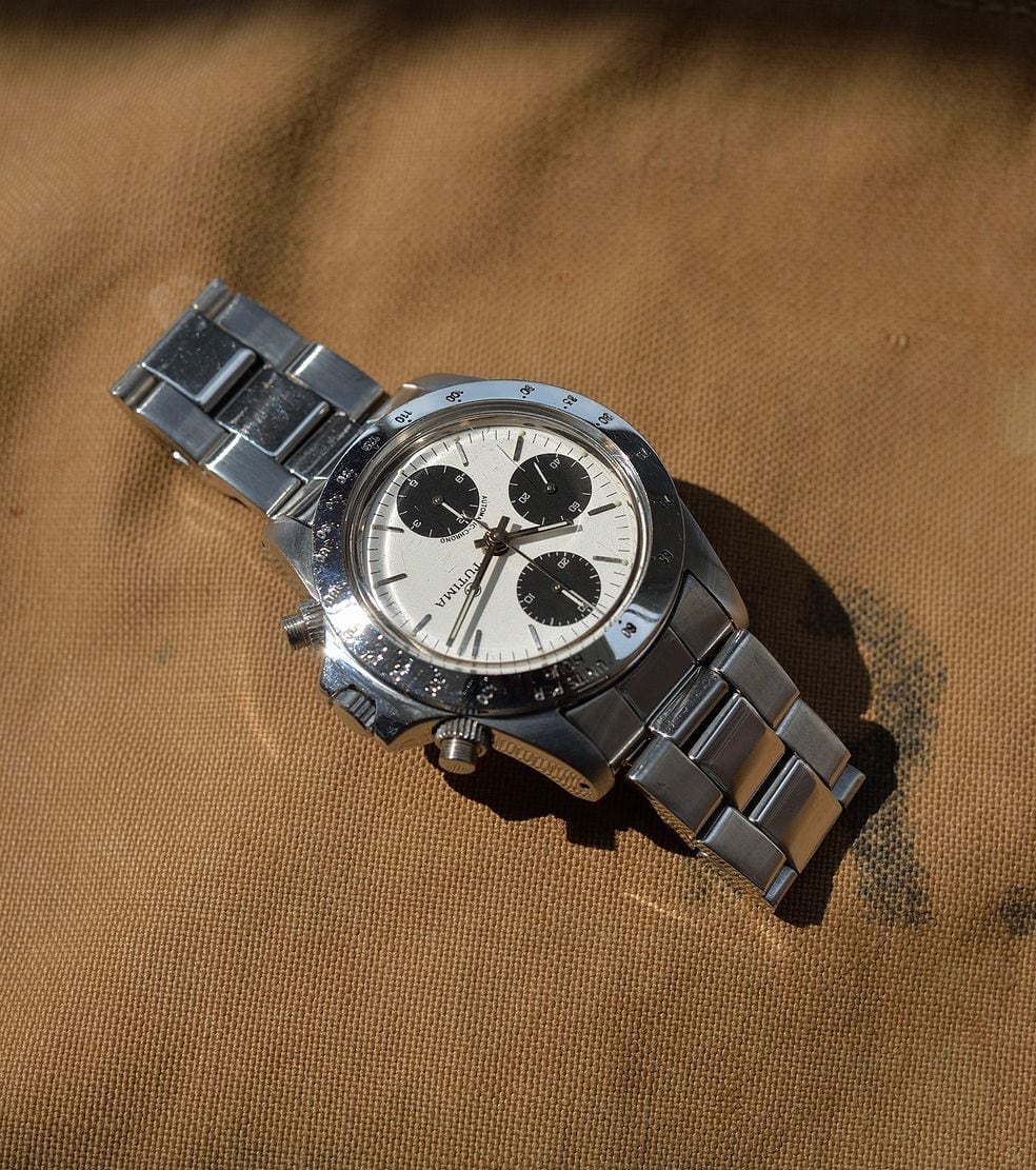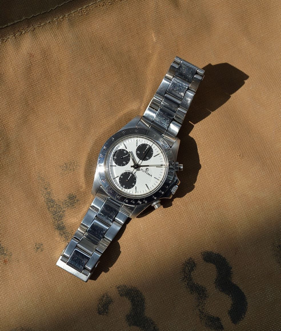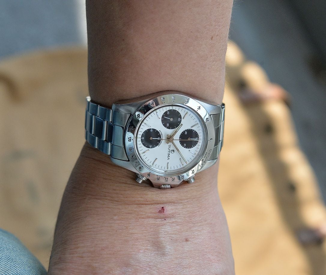 パンダと称されるダイヤルは、このモデルがスポーティーな出自をもっている上、その抜群の視認性をも見て取れます。クロノグラフ針はブラック。レッドのクロノグラフ針をもつ同モデルも存在しますが、このシンプルな配色が使いやすいシンプルなものと言えます。プッシャーは誤動作を防止するロック機能をもっています。大型のリューズはドライブ時にグローブをしたままでも操作できます。