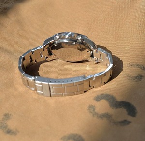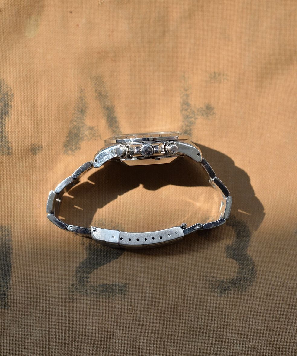 ダイヤルはホワイト、インダイヤルはブラックですが、経年変化によってブラックカラーは墨色にカラーフェイドしています。インデックスはバー 各インデックスにはドットインデックスもありますが、こちらもクリーム色に変化しています。夜光塗料はまだ少し残っていて暗所ですと光ります。夜光はトリチウムではないかと思います。風防はプラスチックで傷などありますが視認性に問題はありません。風防はドームでクラシカルな風合いがございます。ベゼルはスティールでポリッシュされています。タキメーターの文字は掘り込み。とても手の込んだ造りになっています。