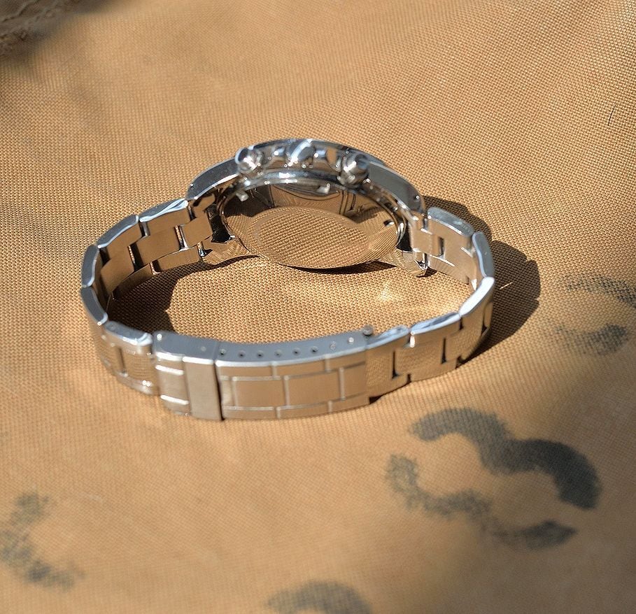 ブレスレットは純正の3連の配置のブレス。中央のコマは鏡面であり、ややエレガントな雰囲気を持ちます。バックルはダブルロック。