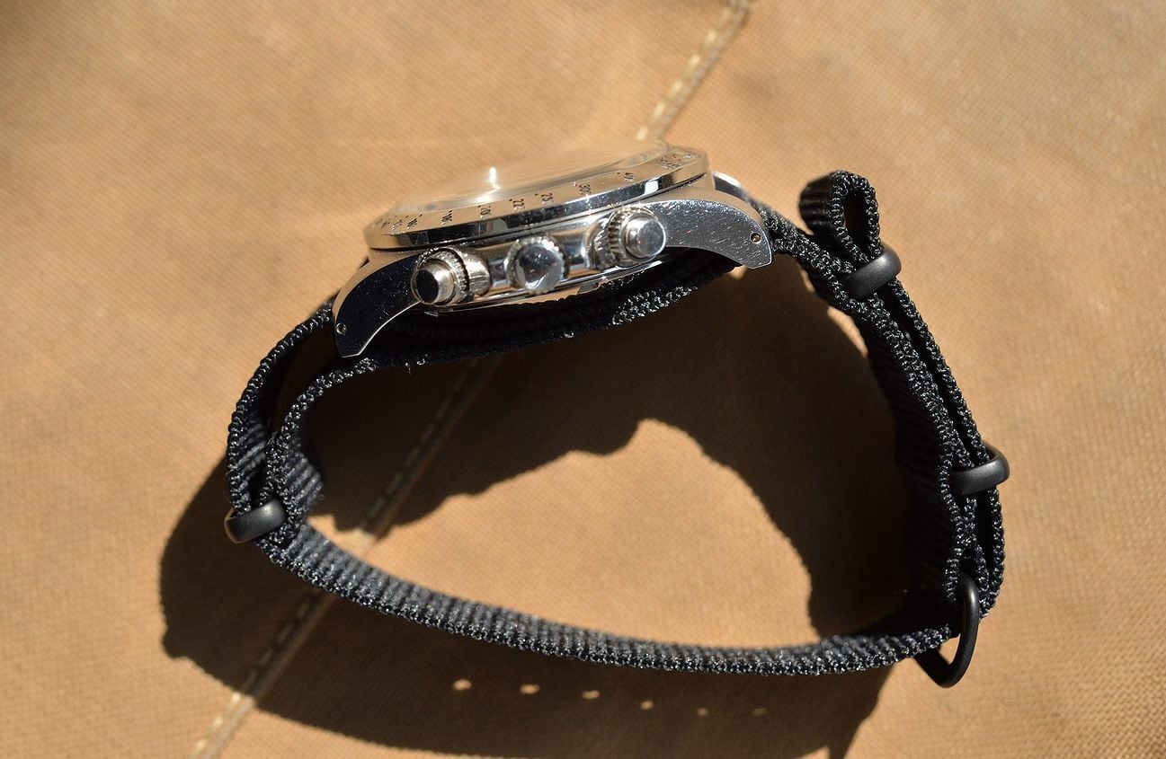 今回、このスポーティーなツールウォッチに合うブラックカラーのNATOスタイルのナイロンベルトを合わせて販売します。このNATOベルトはブラックの艶消し金具を取り付けています。ナイロンの硬さがほどよく、水捌けにも優れた弊店推奨のベルトです。フェニックスG-10とはまた違う付け心地のNATOです。使い込めば使い込むほど風合いの増すNATOベルトです。
