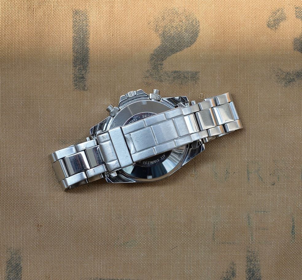 時計のデザインはチュチマ製の通常の軍用時計然とした佇まいとは違い、スイスを代表するクロノグラフと似たデザインコードを表現しています。しかしながら、今にしてこの時計を見てみると内部機械には信頼性の高いバルジュー製の7750という名機として現代でもその名を馳せるムーブメントを搭載し、ケースサイズ40mm、堅牢なリューズとプッシャーを配置し、ケース厚も薄く仕上げてあり、堅牢なツールウォッチとしての魅力が相当にある時計と言えるでしょう。