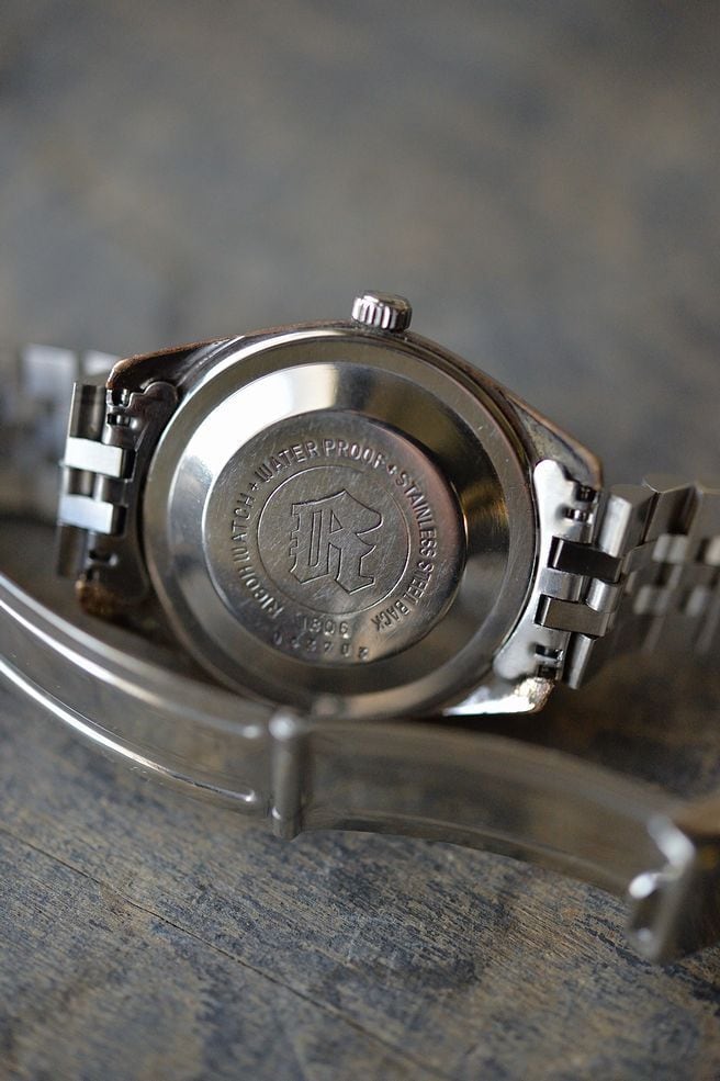 インデックスはバーですが、細かなカッティングがされていて、光の加減で様々な表情を見せています。メーカーとモデルネームはブラックプリント、ロゴマークはやや経年で劣化して薄くなっていますが、なんともいえない雰囲気です。