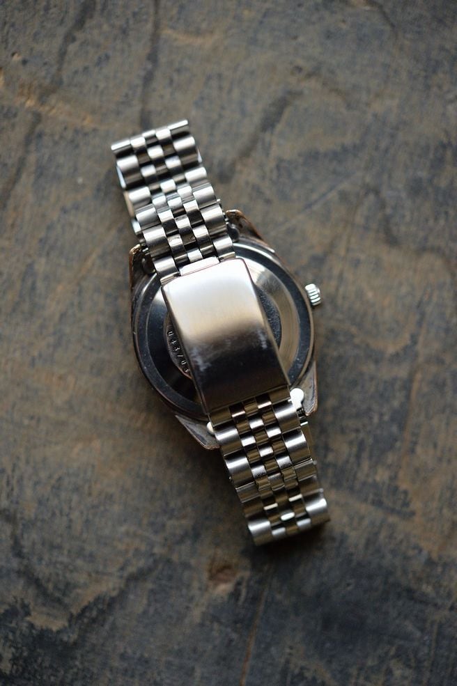 付属するベルトはステンレススティールのジュビリーブレスレットです。時計に非常によくマッチするブレスレットです。ストラップは使い込んだHOWEEN シェルコードバンのレザーベルトの使用例も画像にございます。
