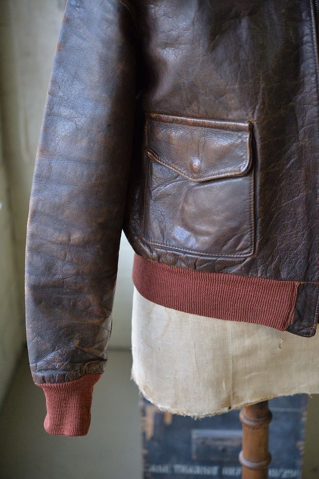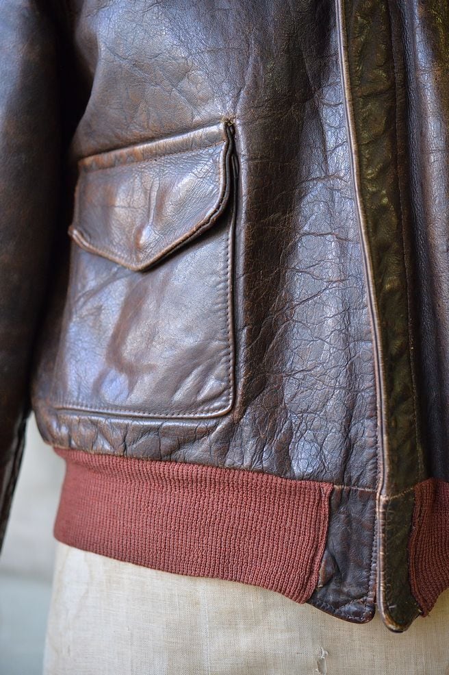 This is a relatively early model A-2, and is a carefully crafted jacket. The rib knit used features the red rib commonly found in Aero Leather, both at the hem and sleeves.