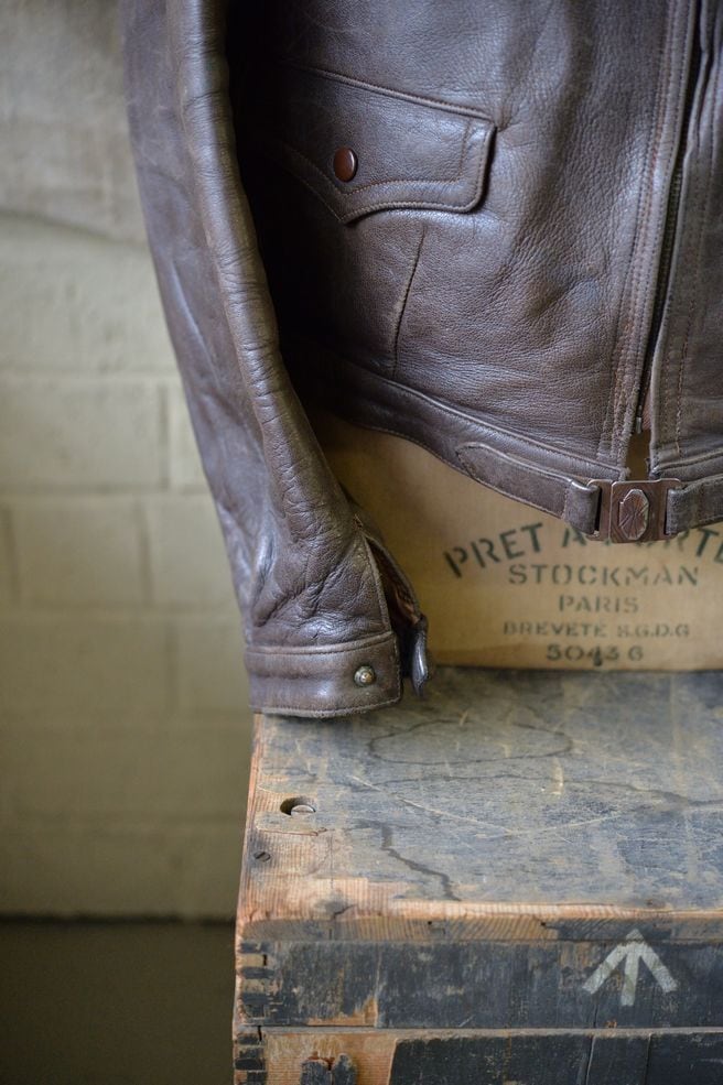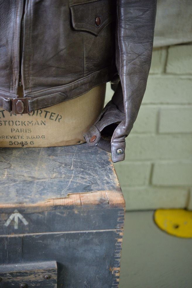 今回入手したジャケットは、米国サイズでいいますと40程度にあたる個体です。このジャケットは、年間を通しても何度も見つかることはありませんが入手できる場合も、おおよそ34,36くらいのサイズが大多数であると感じます。さらに元来脆弱なケープスキン製のジャケットのため、コンディションも併せて着用に適した大き目のサイズを手に入れるのは非常に困難になっています。