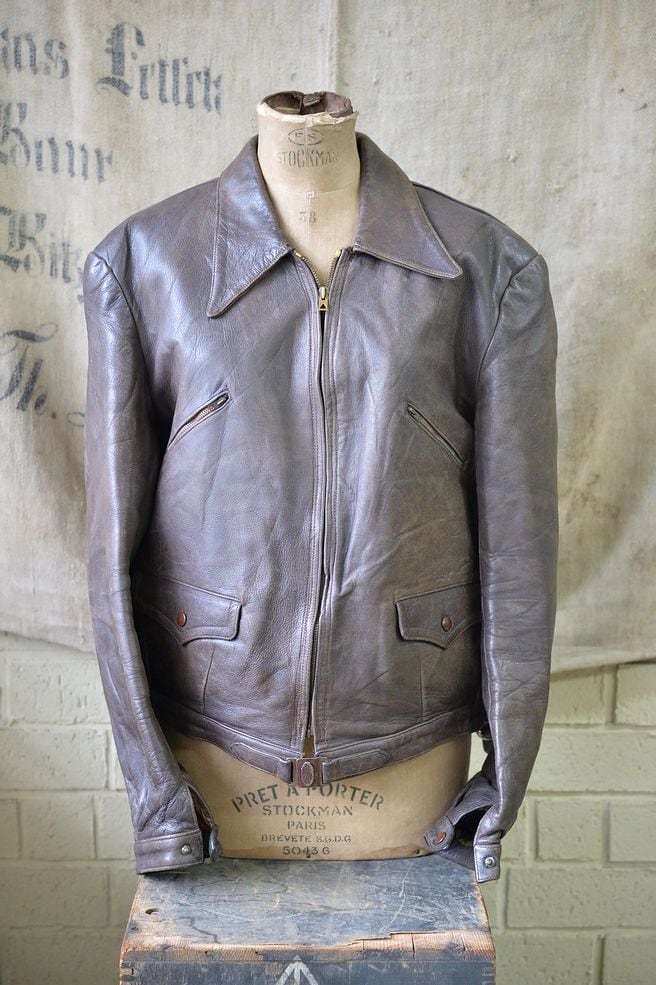 Unlike cold-weather leather flight suits such as the Canal/Channel jackets produced in Germany and Bulgaria, these lightweight leather jackets were often repurposed motorcycle jackets from occupied territories such as France at the time.