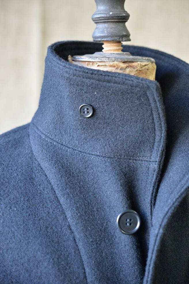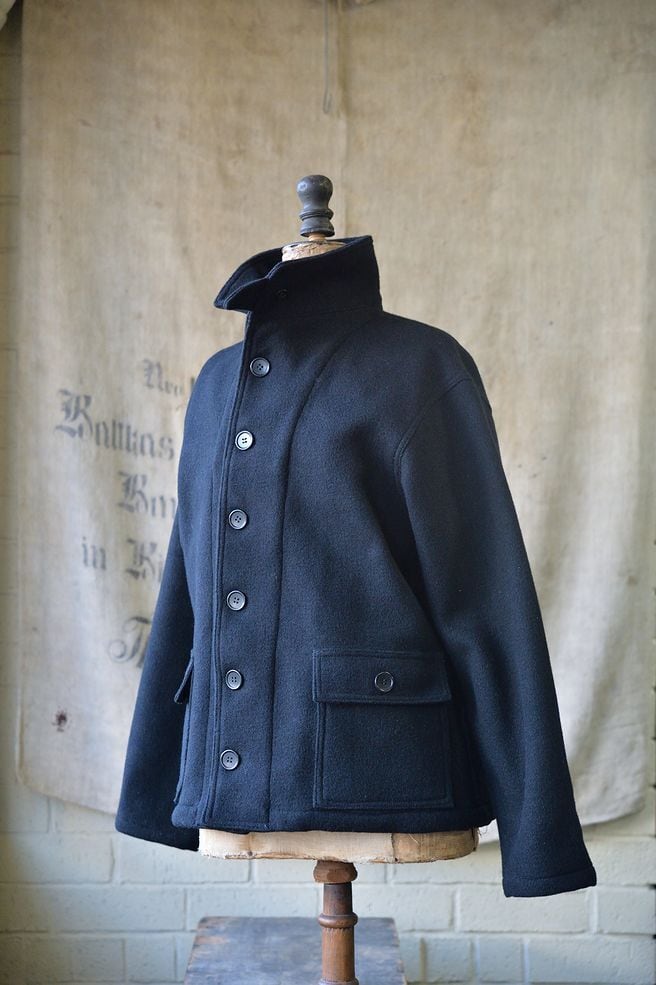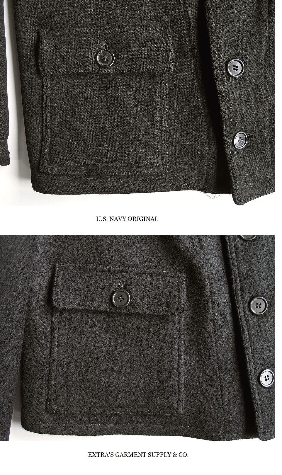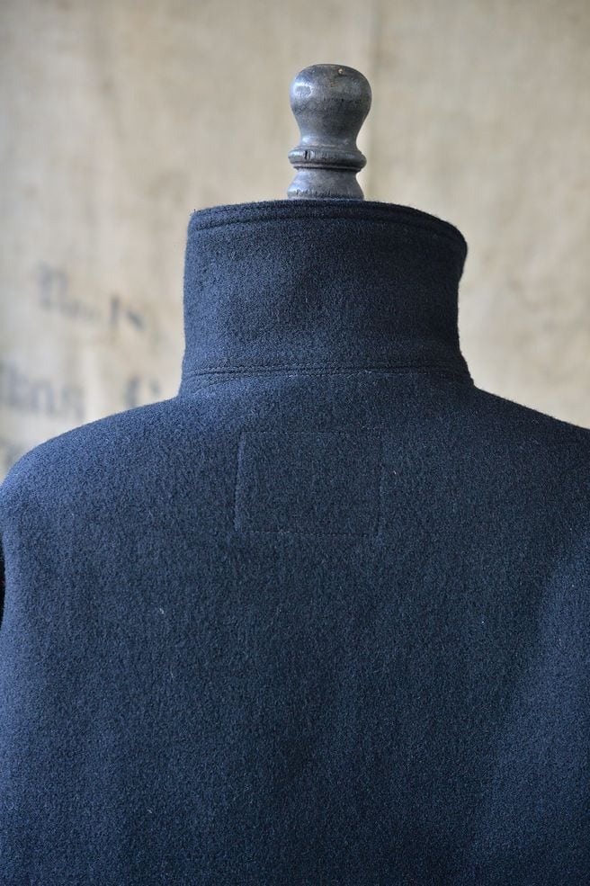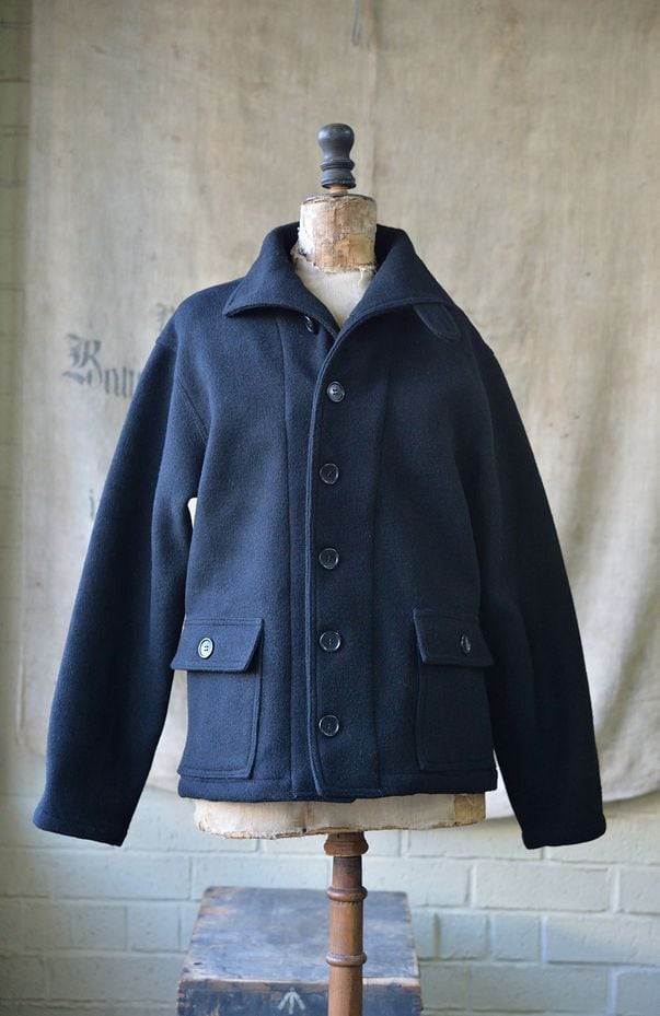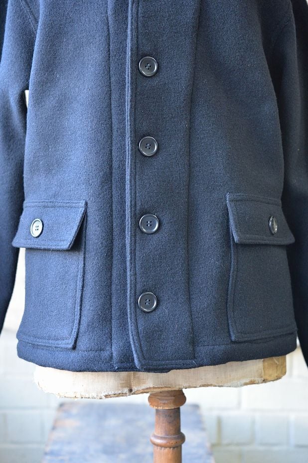2011年その存在が殆ど知られていなかった、このサブマリンジャケットを世界で初めて精密に復刻いたしました。製作にあたって、現存する実物を20着以上検証し、さらに当時の海軍の資料を分析致しました。また弊社所有の、ヴィンテージオリジナルのサブマリンジャケットのウール生地を分解し使用される糸から分析を行い、当時の実物に使用されていた表面がヘリンボン織り、裏面が格子織りのダブルクロスウールを再現するため、繊維の町である愛知県一宮市において生地の製作をおこないました。弊社のサブマリンジャケットは、ヴィンテージさながらに再現された日本製100%ウールを使用しています。使用ボタンはホルムアルデヒドが含有された国産特注ボタンを使用しています。 またポケットスレキやハンガーループの生地も徹底的に再現しています。