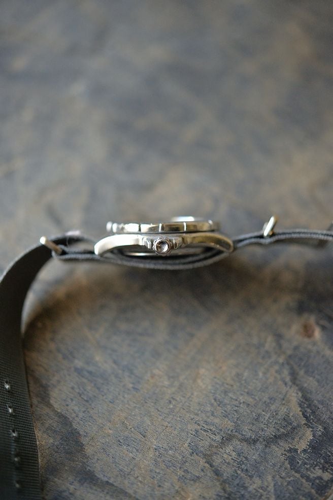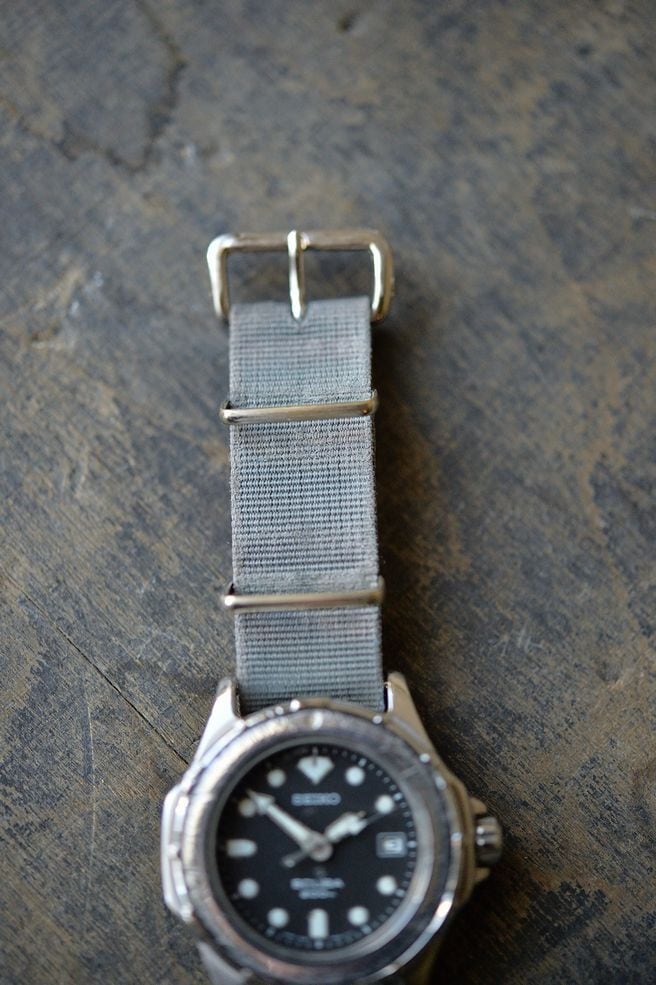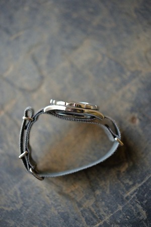 エイジングしたグレーカラーの18mm NATOストラップの質感と併せてデニムなどのスタイルにとても合うストロングな時計です。