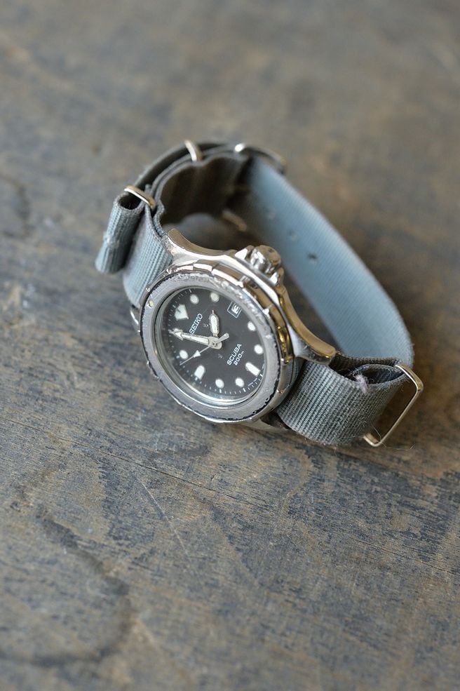 The aged gray 18mm NATO strap adds a touch of texture to this robust watch, making it a perfect match for denim and other styles.