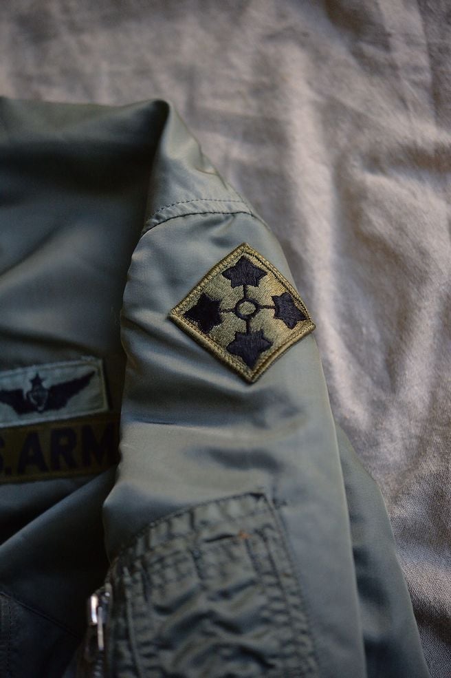 取り付けられたパッチは、ナイロン製の米陸軍識別テープとコットン製のネームテープ、メロウエッジの第4歩兵師団パッチとコットン製の