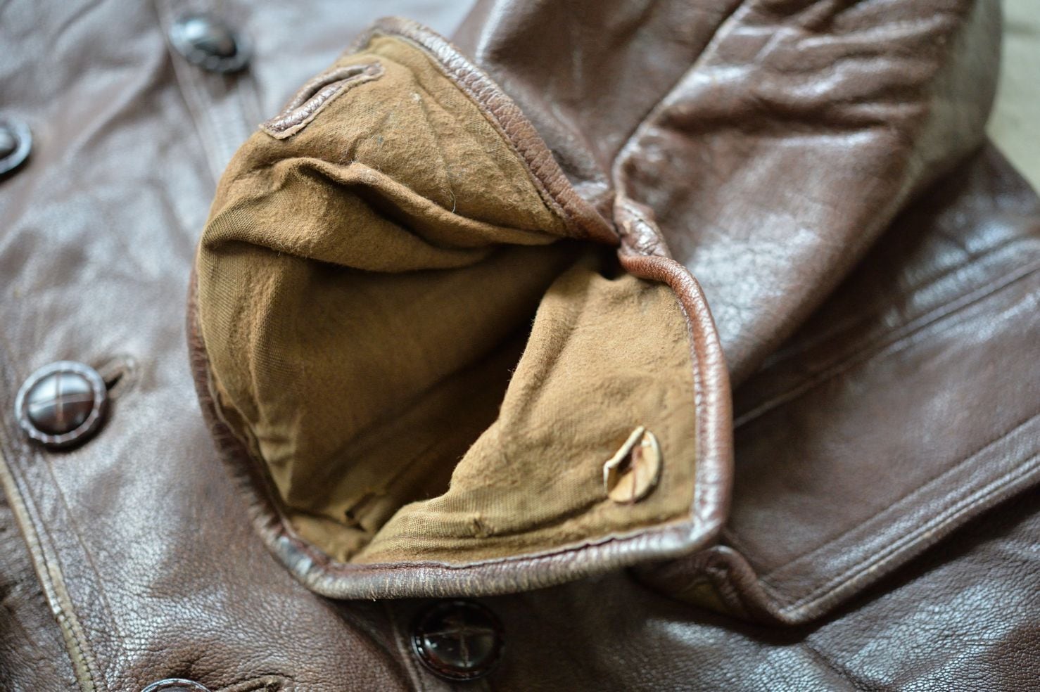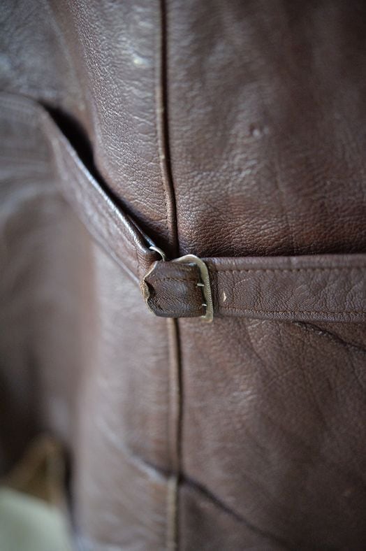 レザーにはフィニッシュが剥がれている箇所や傷などがあります。ただし、硬化しているような箇所や破れている箇所はなく十分に着用に耐えうる状態です。フロントはダブル、袖にボタン、バックにサイズアジャスターベルトがボタンで調節できるようになっています。バックには特徴的な金属金具を用いたサイズアジャスターがあります。差し込み方式でサイズを調節するためのパーツです。フロントボタンが一部交換されています。