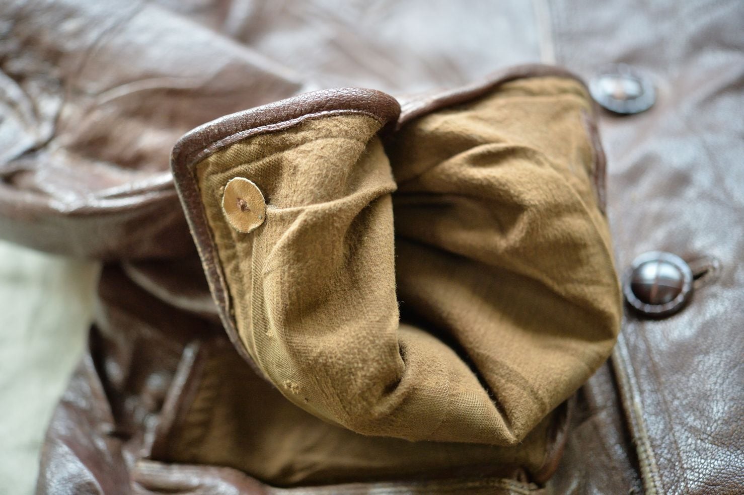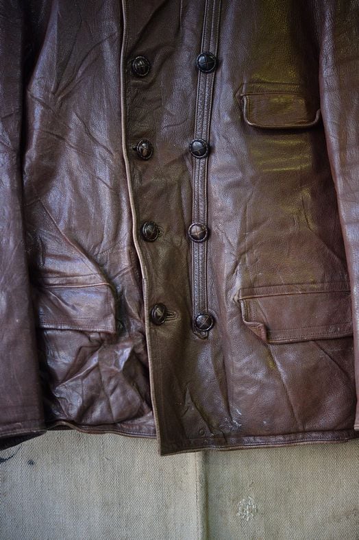 このスタイルのワークジャケットに使用されるレザーは多くがゴートスキンですが、このジャケットもGetskinn、ゴートスキンレザーが使用されています。レザーコンディションは非常に柔らかな質感になっています。ポケットフラップなどは保管に伴って折れ目がありますが、レザーの強度に全く問題はありません。
