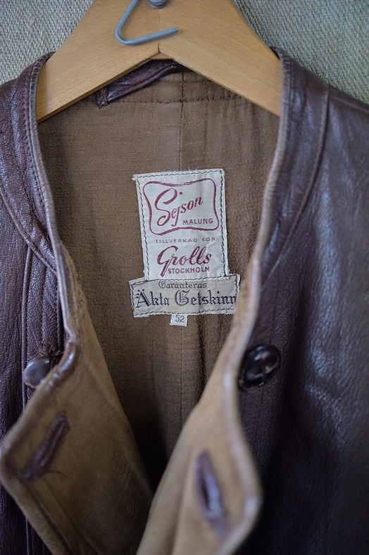 このスタイルのワークレザージャケットは1930年代の末期(推定ですが)から同じような形状でレザーを変更して、1970年代ごろまで製造されていたと思われます。かなり多くのメーカーで製造されており有名なところではMASENS社、ANBRO MALUNG社製などがあります。これら多くの製品のラベル表示をみると、生産はスウェーデンであることが分かります。一部はスウェーデン陸軍において、使用されていたと思われる個体も以前に入荷しました。この軍用に使用されたと思われる個体には、ポケット内部にスウェーデン軍のマークが刻印されていたり、軍用を意味するメーカーラベルが付いていたりしました。