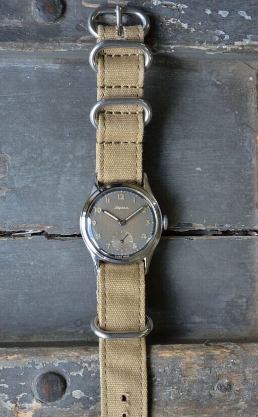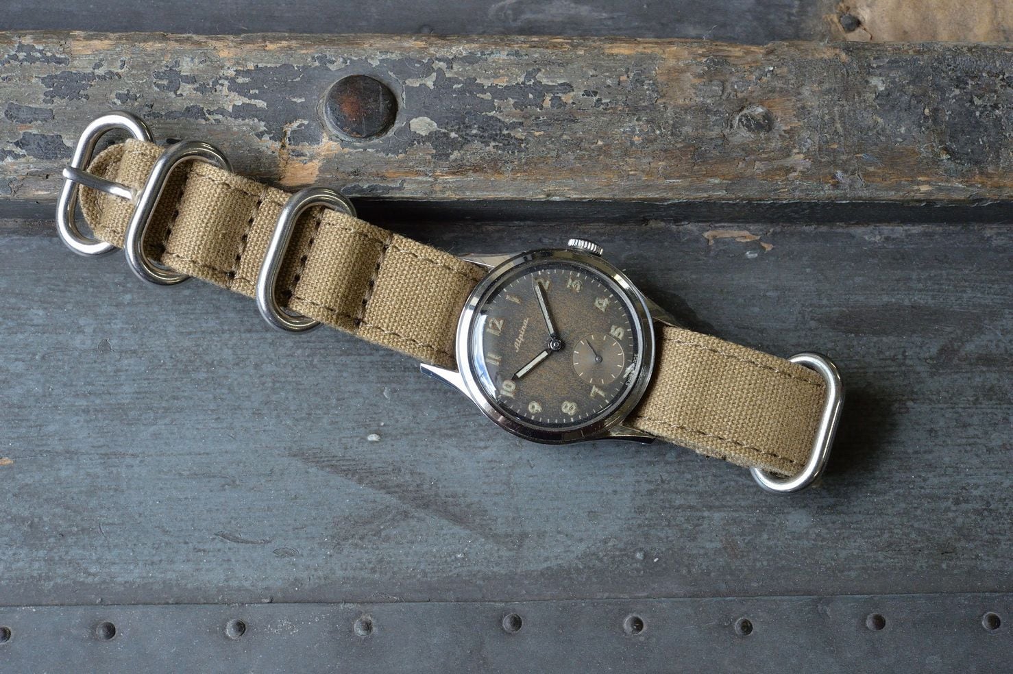 今回はコットン製の16mmのオリーブグリーンのベルトをセットしています。ベルトとの適合性から、よりミリタリーウオッチの雰囲気を醸し出す仕様に致しております。