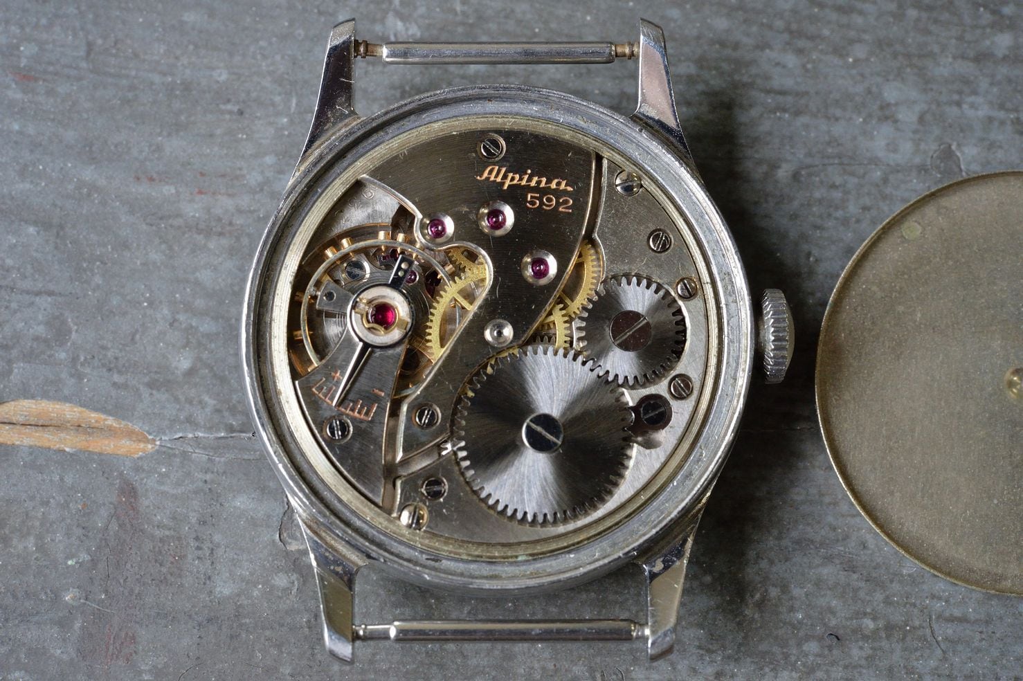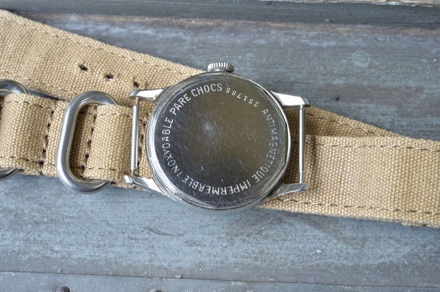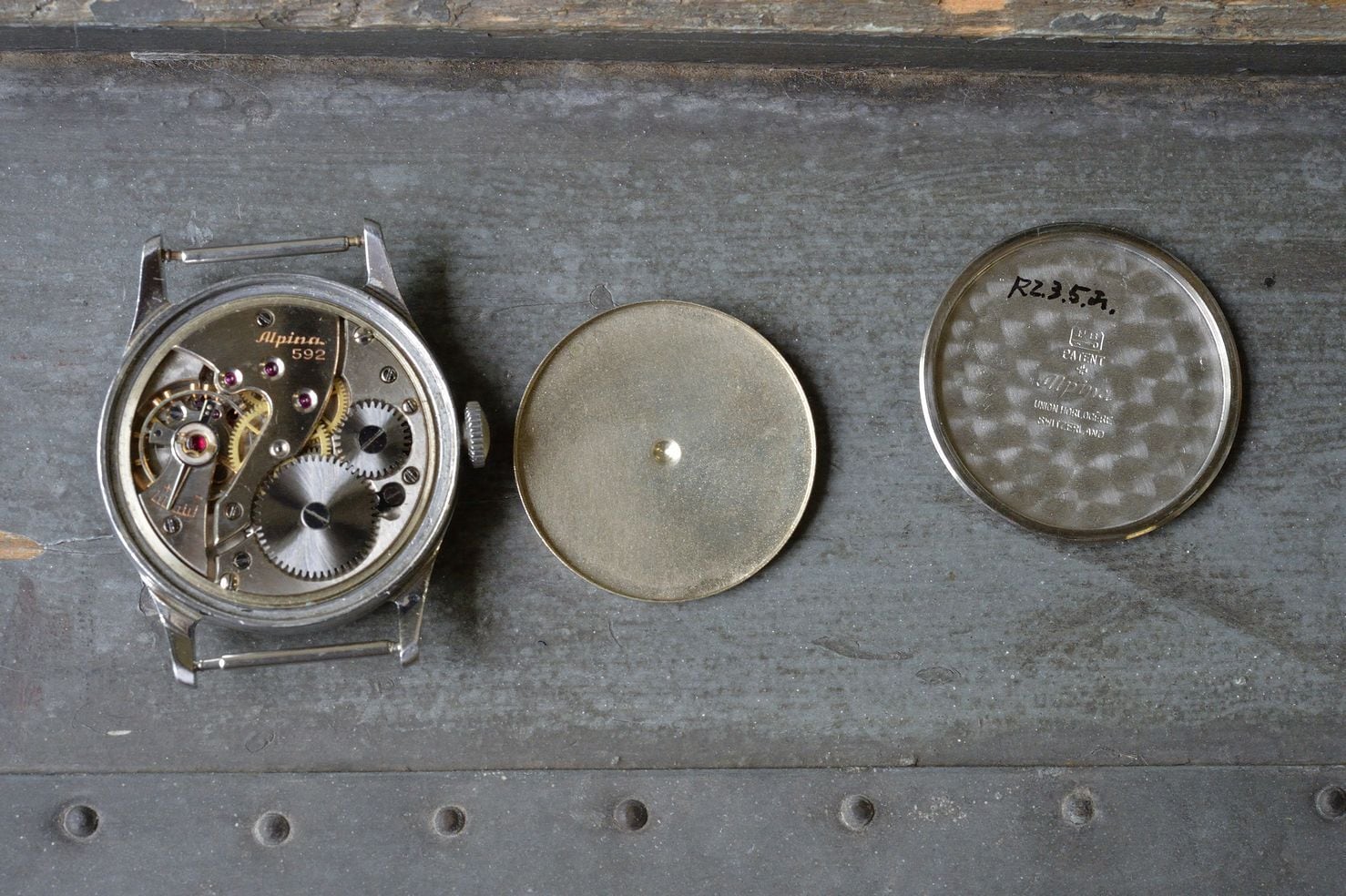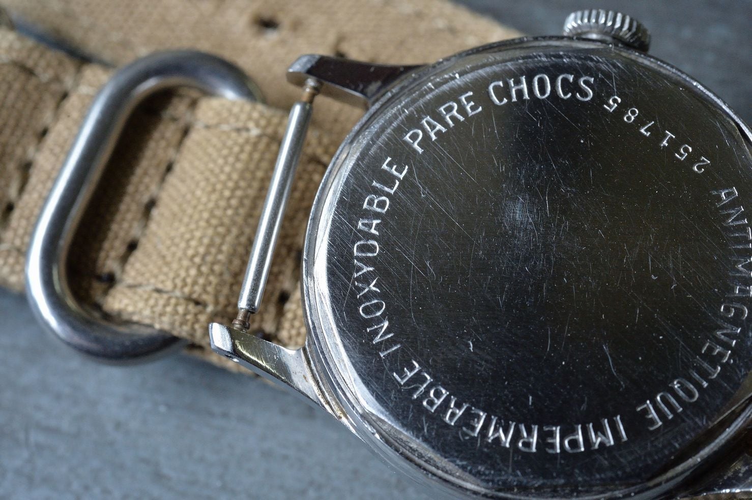 キャリバーは名機とされるCal.592が使用されています。1940年代の多くのモデルに搭載された機械です。ムーブメントとケース内部の構造を見ると、ここにも軍用時計のディティールが垣間見えます。ケースバックの刻印にあるようにANTIMAGNETIQUEとあるように、ケース内部にはムーブメントを防塵保護し、帯磁を防ぐためのインナーケースが挿入されています。2重構造のケース内部がしっかりとムーブメントを守り、堅牢な構造になっています。これらの構造は1940年代の軍用時計に見られるディテールです。ケースのラグ幅は18mm。ばね棒を使用できる設計ですので、通常のベルトや引き通しのベルトも使用頂けます。
