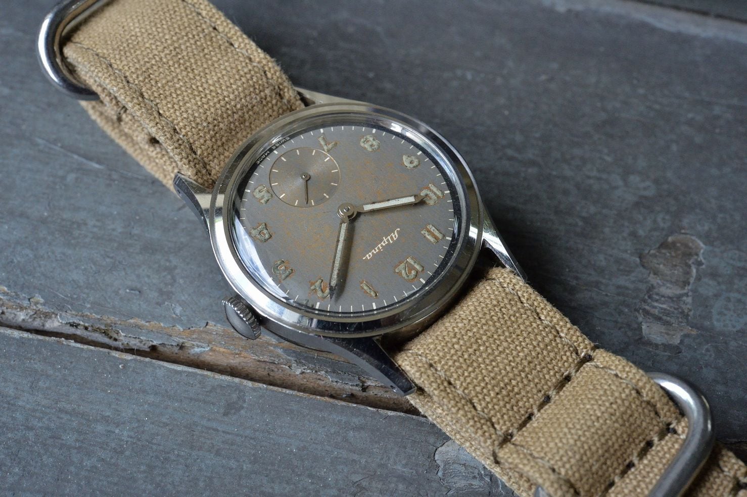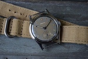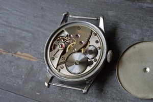 文字盤、ケース、針など軍用の意匠も垣間見える時計ですが、軍用ではありません。稼働良好で巻き上げも良好で普段使いできるコンディション。ケースバックはスクリューバックです。ヴィンテージウォッチですので、防水性は防汗程度とお考え下さい。