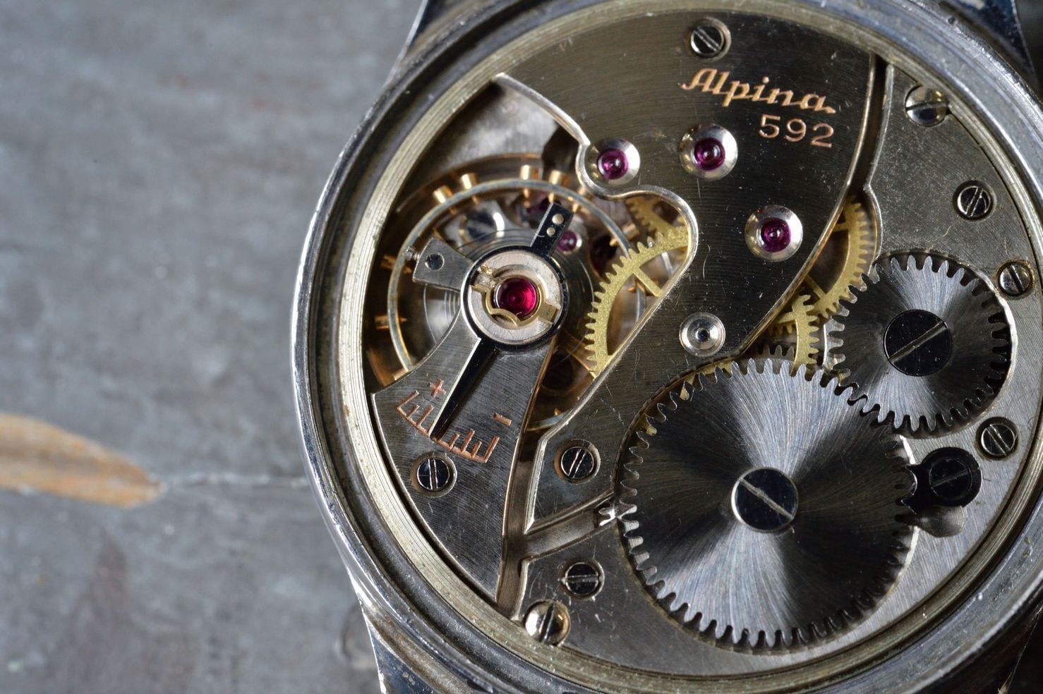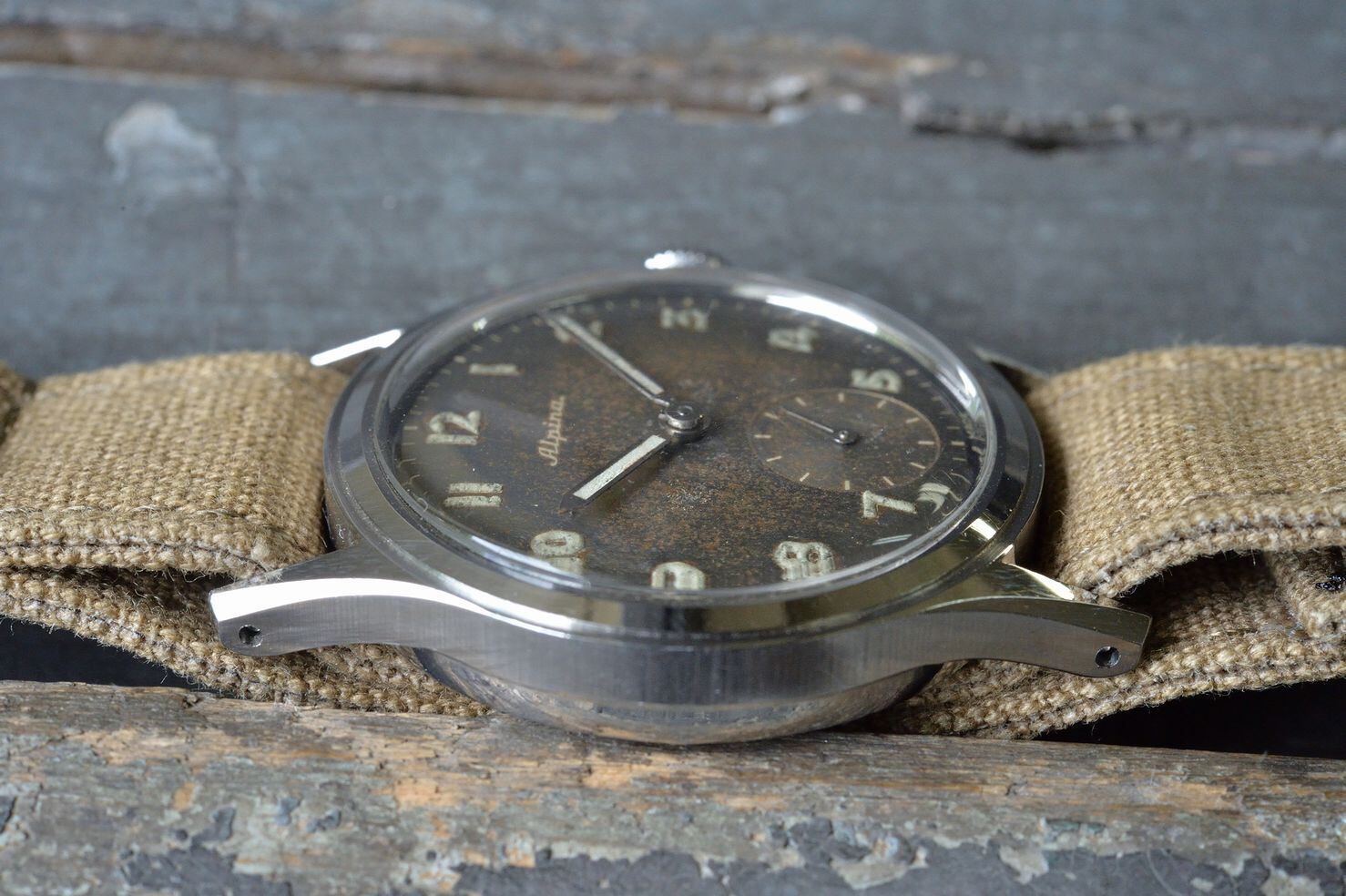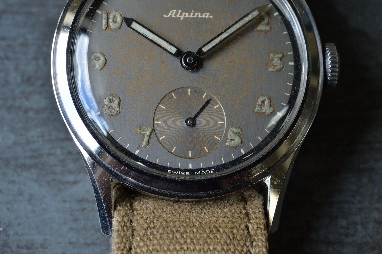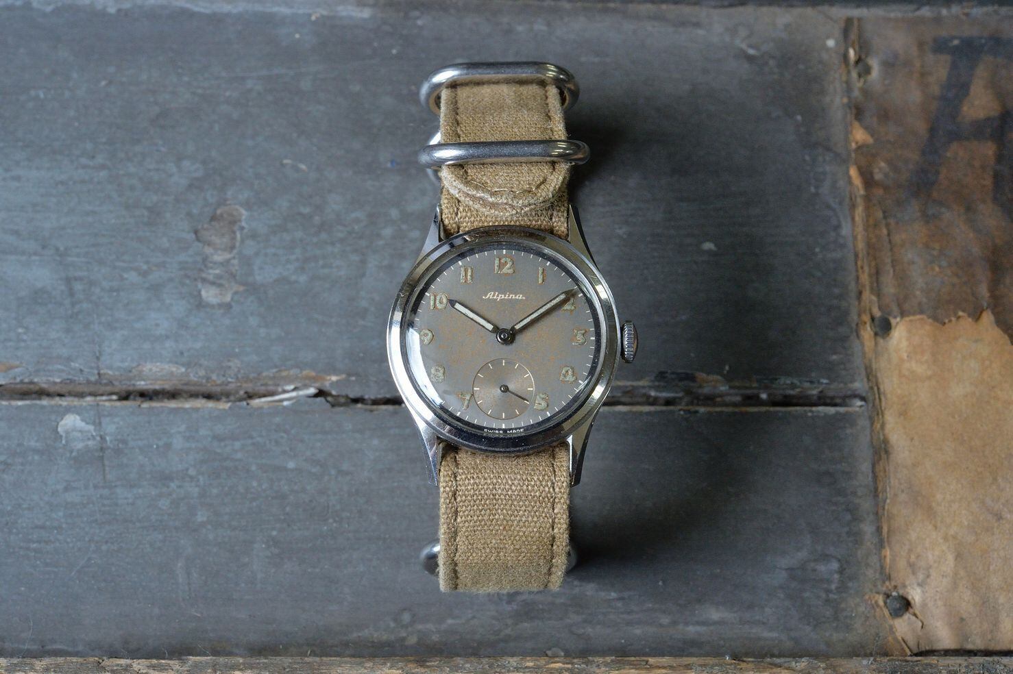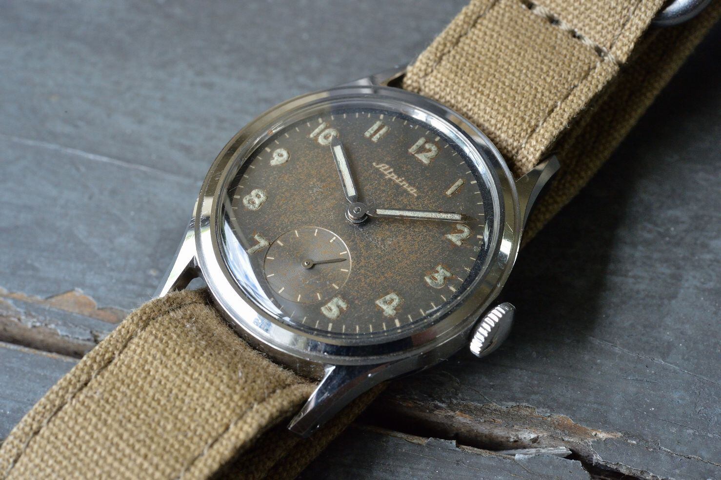 長い歴史のあるアルピナ社は一時期にはドイツに工場を構え、スイスの時計会社の中でもさまざまな時計を開発し販売したメーカーとして知られます。この一見軍用時計にも見えるシンプルな時計は、構造的にも本格的な軍用時計の構造もみられるスポーツウオッチです。ややスリムなラグと、サイドをストレートに切り取ったようなケースが無骨な表情を見せています。薄いが大型のリューズも操作性がよく、グローブをしたままでも巻き上げや時刻合わせができる実用性をもっています。