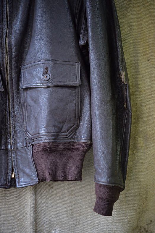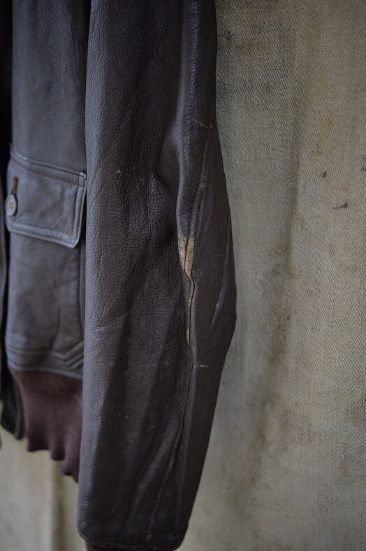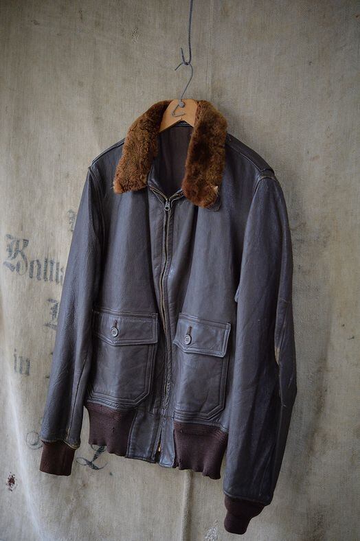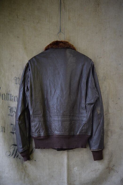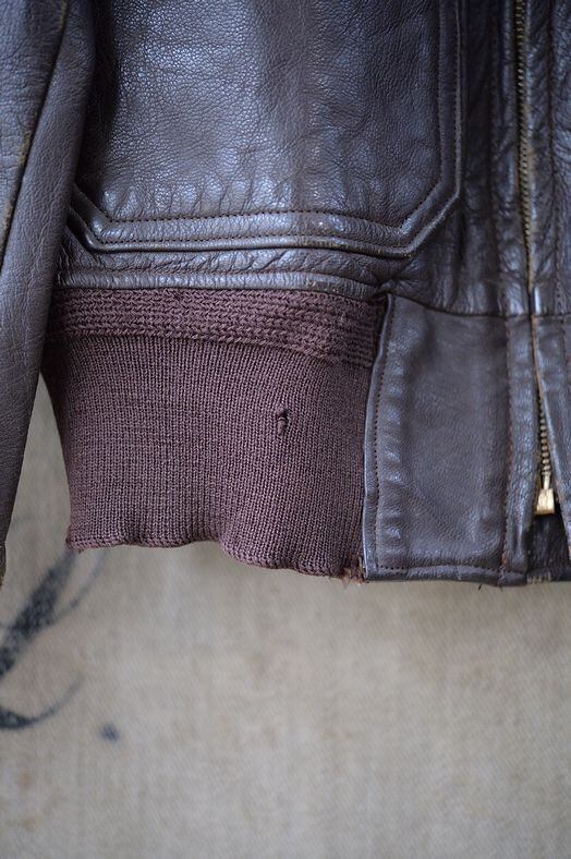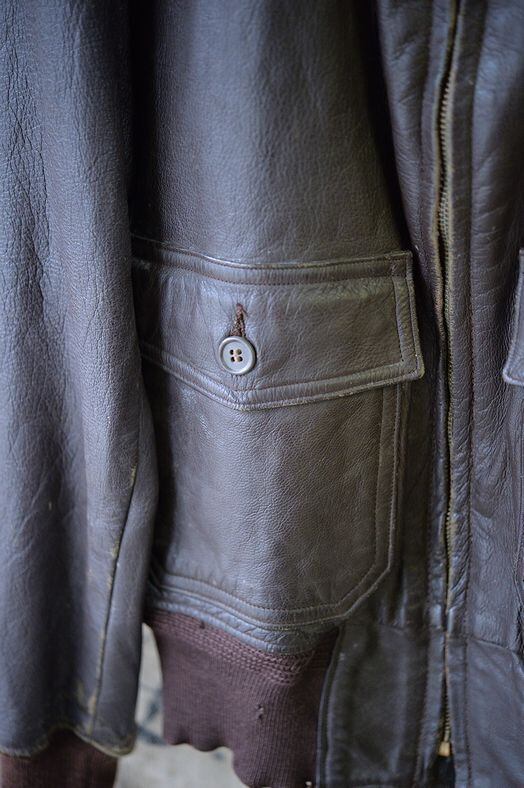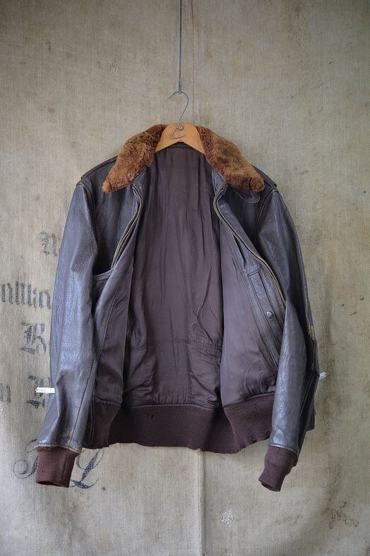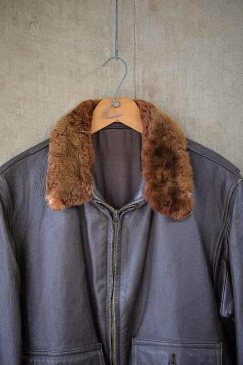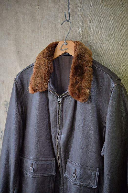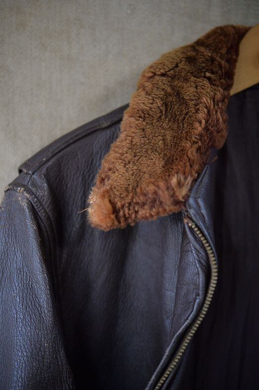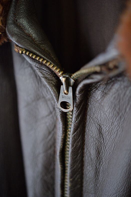 肉厚なゴートスキンレザー、カラーはブラウン。 ライニングはレーヨンです。残念ながらラベルは欠損していますが、パッチ取り付け痕などのないコンディション。襟ボアはボリュームがあり、抜けのほとんどないコンディション。フロントジッパーはリペア交換されています。現状ではTALON製のブラスジッパーですが、当店の交換作業ではありません。ジッパーは一部に緑青がありますが作動は良好です。海軍所有物表記のパンチングが小型のものとなり、フロントフラップにパンチングされています。