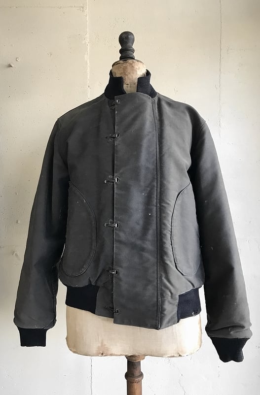 一般的には「フックデッキジャケット」と呼ばれる1940年代の米海軍冬季用防寒作業システム。このジャケットとトラウザース、一般的にはデッキキャップと呼ばれる布製ヘルメットのセットでスペシャルウインタークロージングシステムとしています。ジッパータイプのジャケットと共に(一部は同時期に生産されています)大戦全期間を通じて米海軍/沿岸警備隊に使用されました。フロントは金属製のフックで開閉し、ライニングはブルーのウールライニング、襟と袖、裾にはニットが使用されています。マテリアルはジャングルクロスでカラーはブルー(濃紺)背面にはU.S. NAVYのマーキングが入ります。