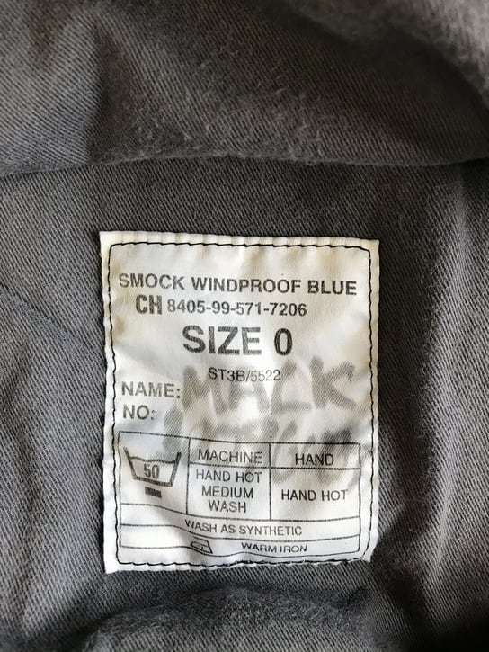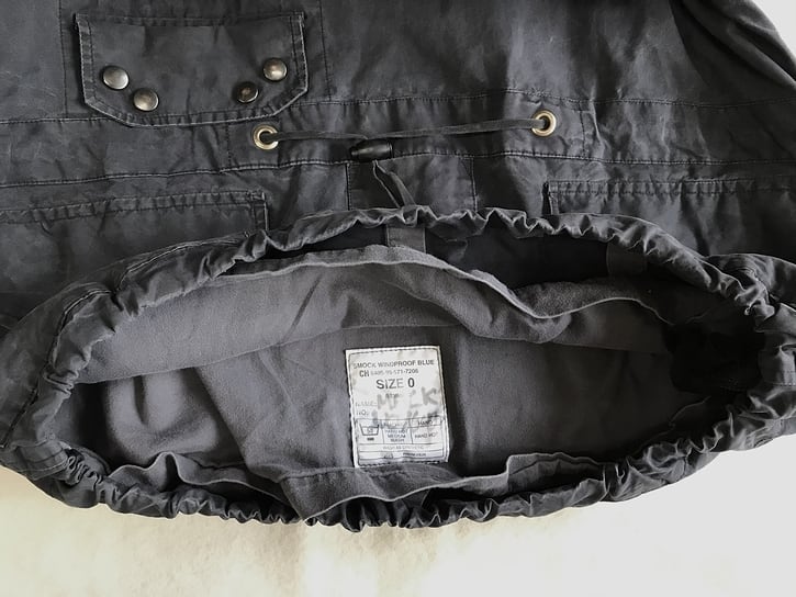ロイヤルネイビー 英海軍 ウインドプルーフスモック。マテリアルはベンタイルが使用され、降雨環境はもとより風をシャットアウトする設計から、甲板上の誘導員やあらゆる勤務において使用されていました。サイズはご存知の方も少ないと思われる、"0"サイズです。もっとも小さなサイズと思われるスモックで、入手の難しいものとなります。ベンタイルは遮風仕様のヘヴィーデューティーな仕様です。色落ちのあるUSEDコンディションで、汚れやアタリの見られるところもございます。また、使用にともなってスレなどもございます。フードバイザーの部分には補修痕もございます。各部のスナップボタンも欠損はありません。フードの金具に錆はありません。裾に内蔵されるコード、ラジオコード用フラップにも異常はありません。