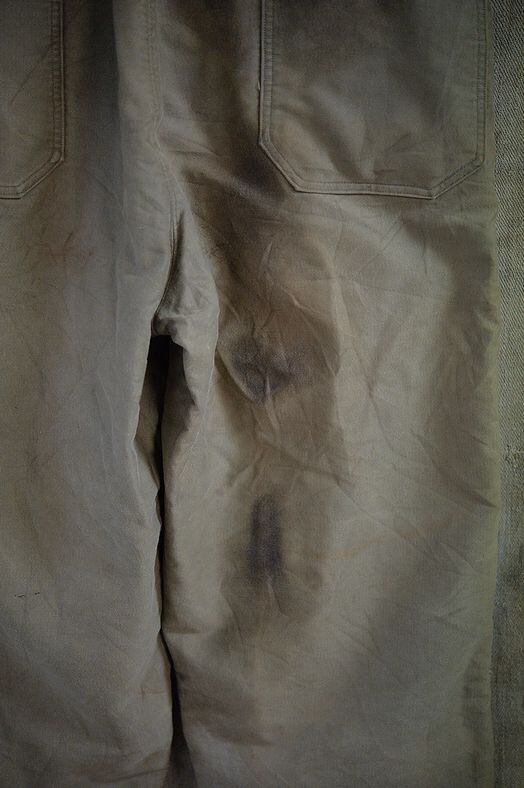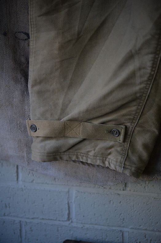 生地はジャングルクロス。ストラップに異常ありません。金属ボタンは13スター。ジッパーはTALON製ブラスで全く問題ないコンディション。すべてのパーツ欠損はありません。インターライニングはウールが使用されており、裾はアジャスターベルトでサイズ調整が可能です。暴風、防寒、防水の用途が盛り込まれた海軍のN-1システム用トラウザース。裾を閉じれば、足首までフィットすることが出来るので冬季オーバーパンツとしてモーターサイクル用にも使用できそうです。