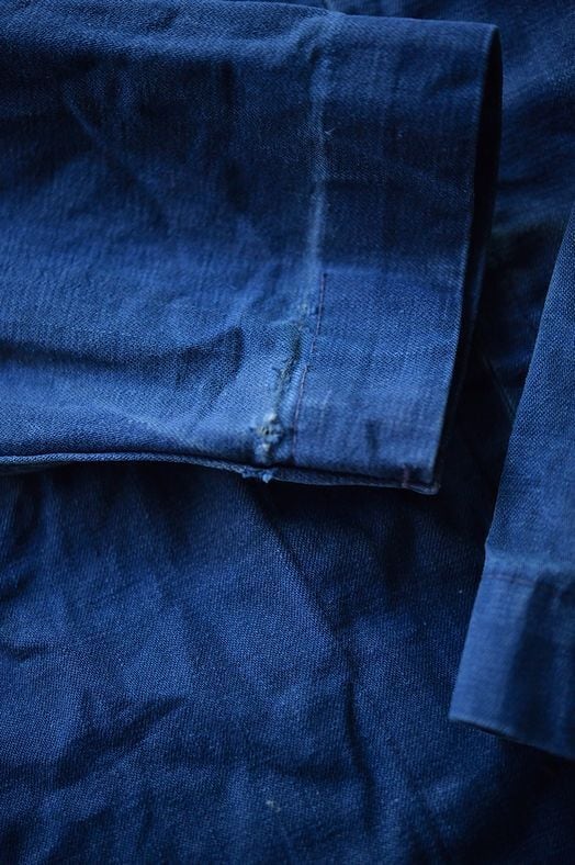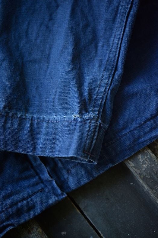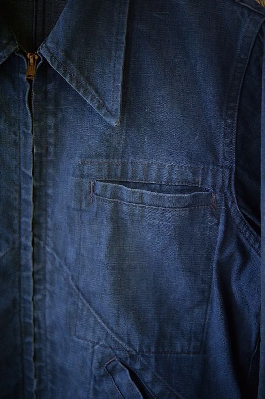 デニムの発色はかなり残っていて、適度にアタリもついていて雰囲気の良いヴィンテージです。左の肩にパッチの取りはずしの痕があり、フロントにはバッジを取り付けていた穴があります。