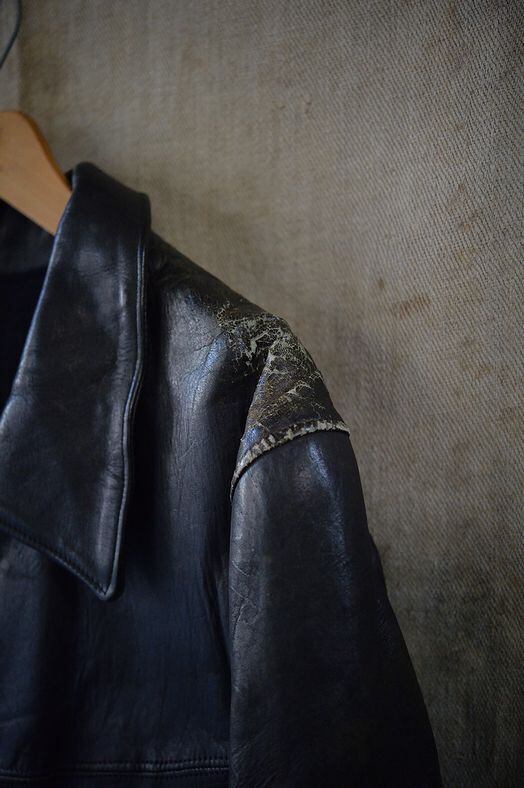 ブラックフィニッシュ、シングルブレスト、ウールライニング、カフス仕様の袖。肉厚のホースレザーを使用した人気の高いヴィンテージレザーコート。