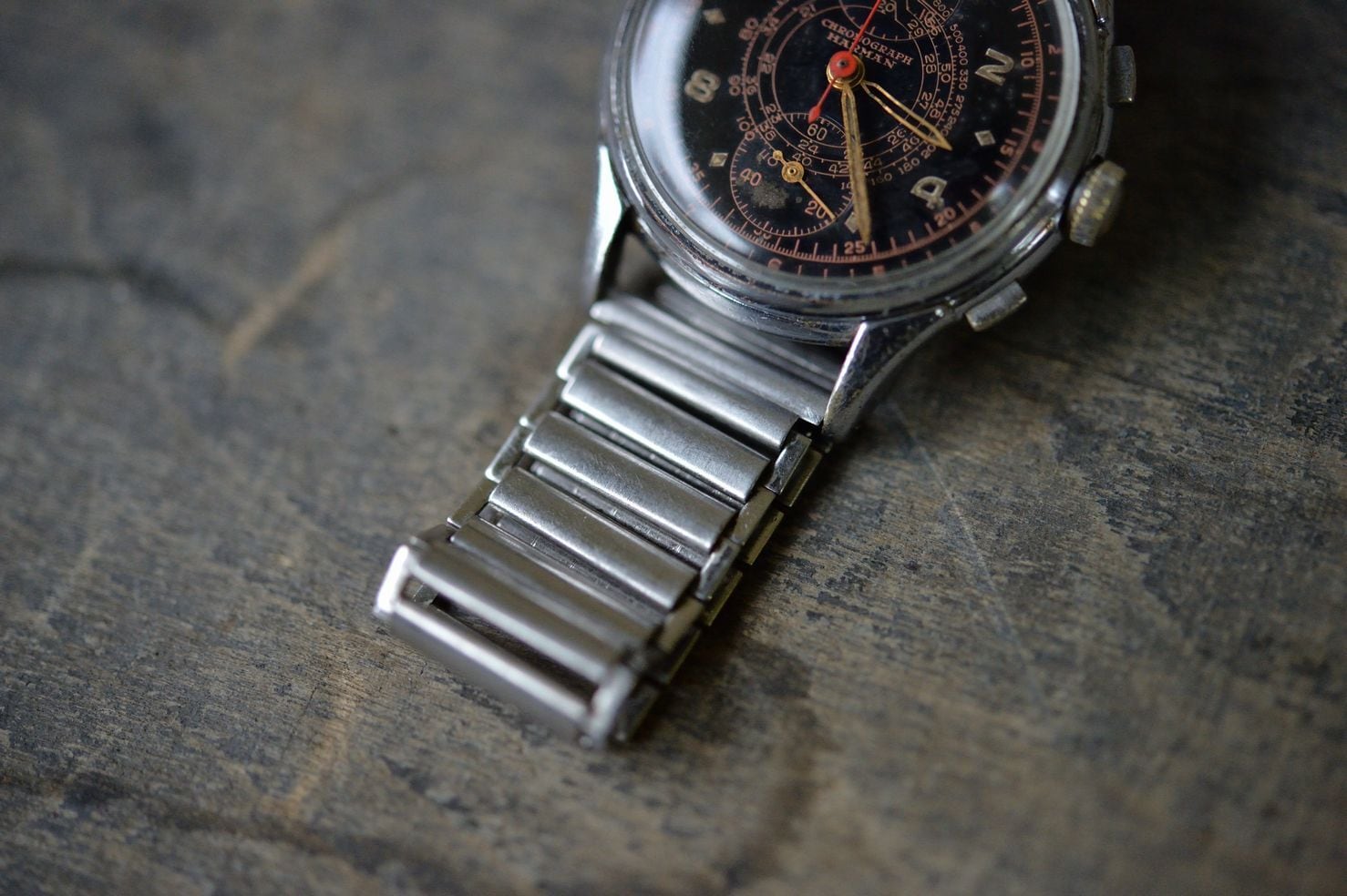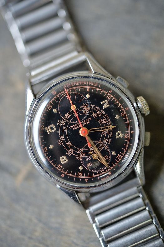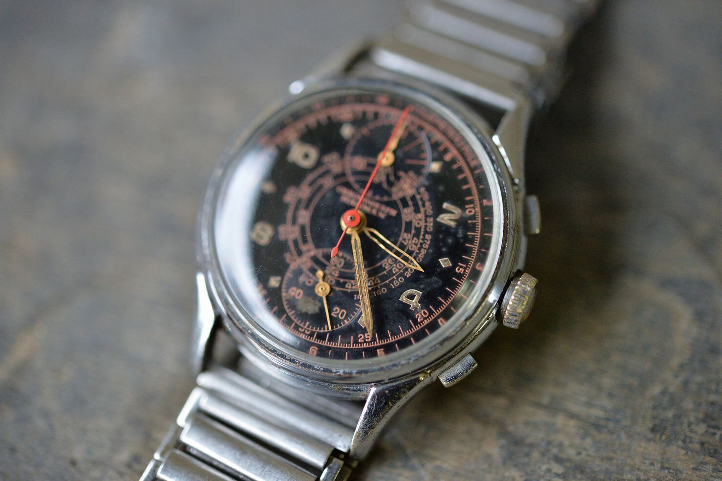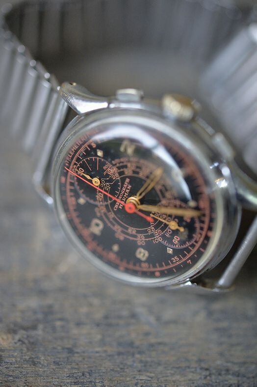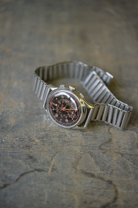 Black mirror dial with red painted telemeter. The chronograph hands are also red.