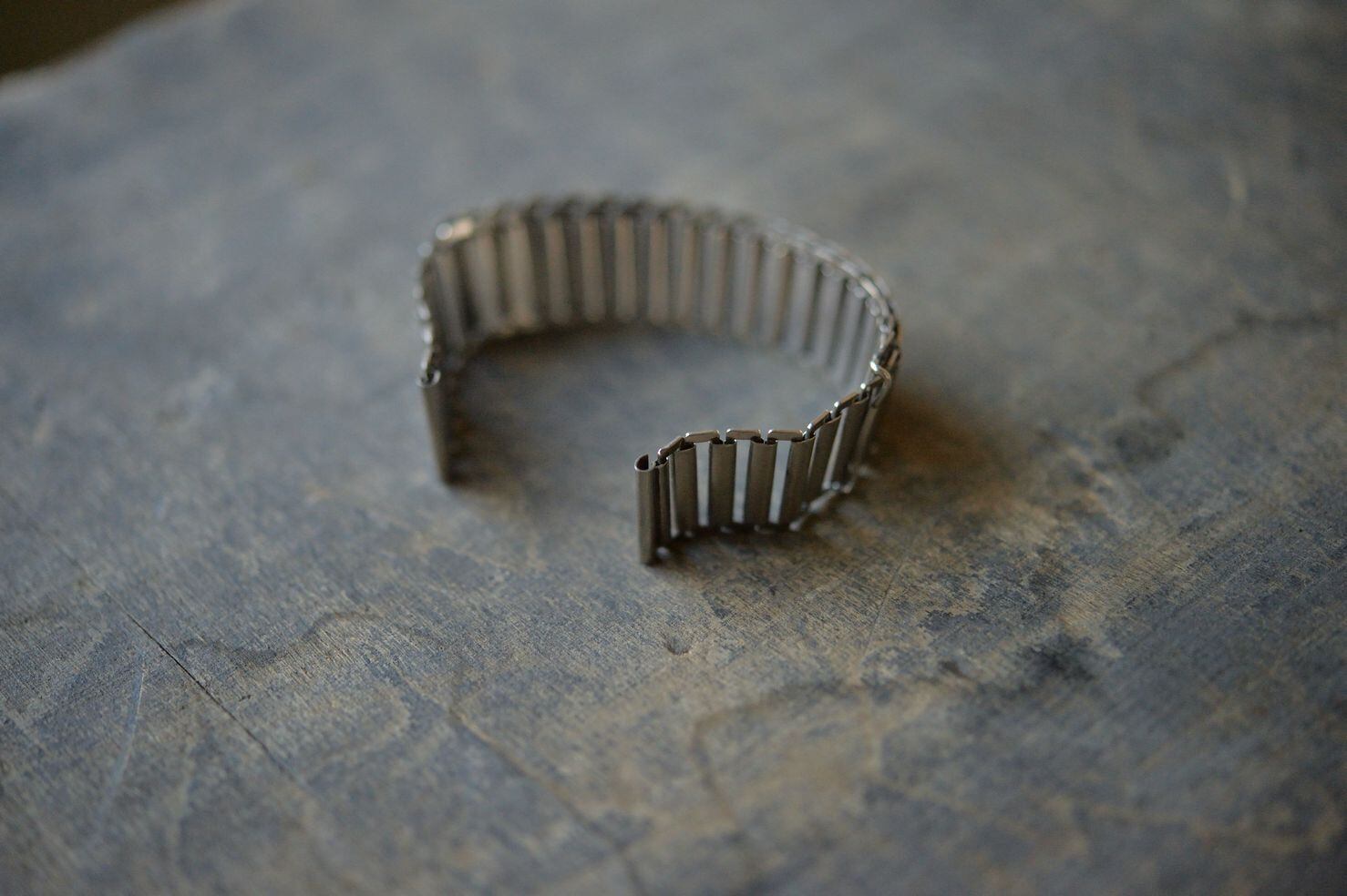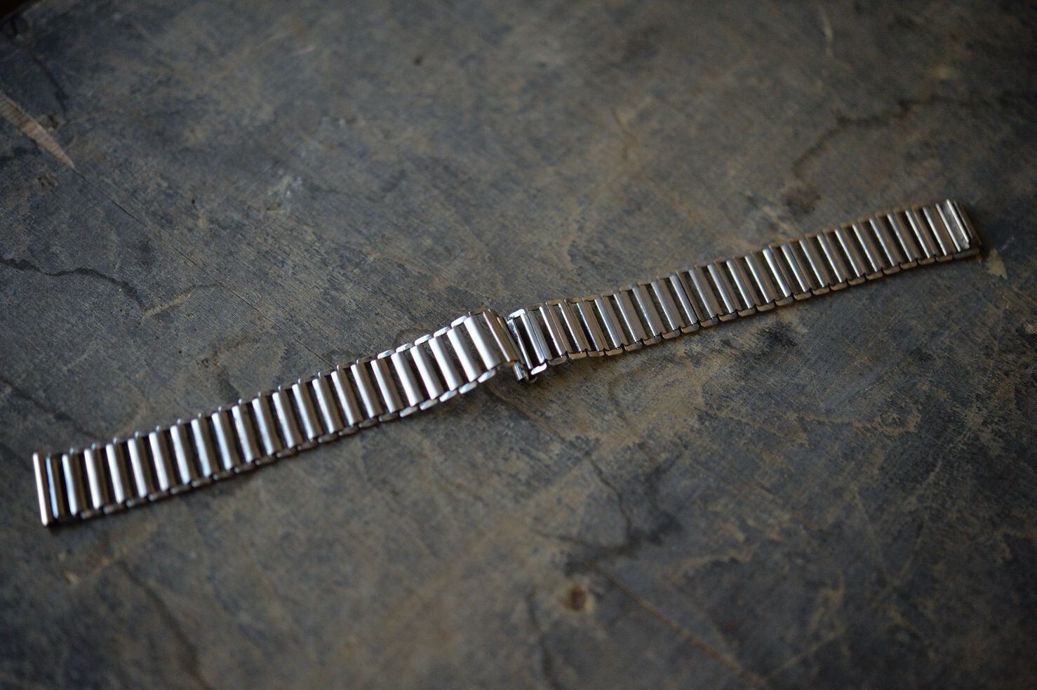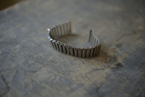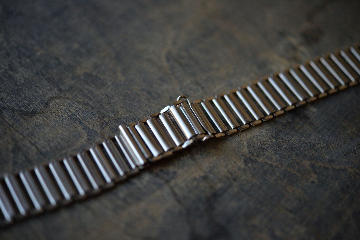 ラダー状の隙間に爪を押し込むことで、フレキシブルなサイズでフィティングが可能なブレスレット。R.A.F. ロイヤルエアフォースの航空機搭乗員用の時計に取り付けられたことでも有名です。長さをフレキシブルに調整できるため、厚手の飛行用ジャケットや飛行服の腕の上から時計を装着することができました。