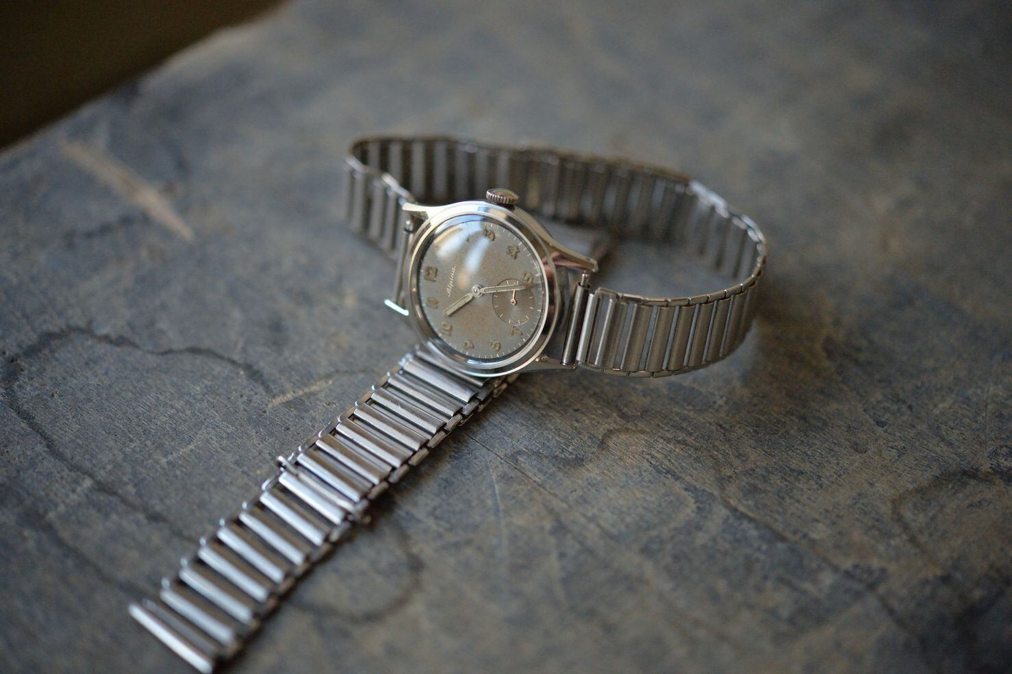 A flexible size bracelet that can be fitted by pushing your nails into the ladder-like gaps. R.A.F. It is also famous for being attached to the watch for the aircrew of the Royal Air Force. Because the length can be adjusted flexibly, the watch could be worn over the arm of a thick flight jacket or flight suit.