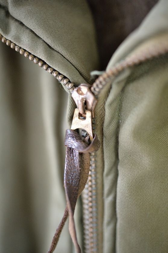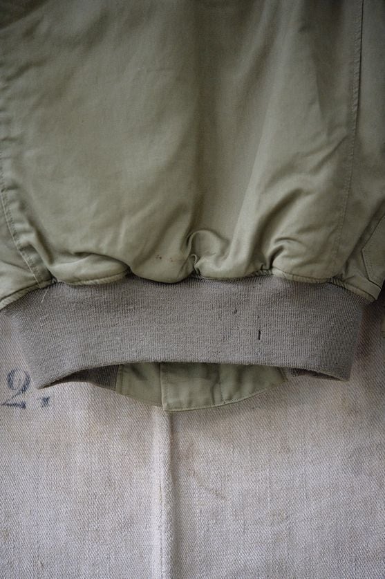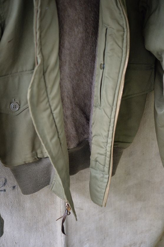 オリーブグリーンのコットン生地、ライニングは海軍で主に防寒用に使用されたアルパカ。大型の襟、ジッパーはCOMMERブラス。