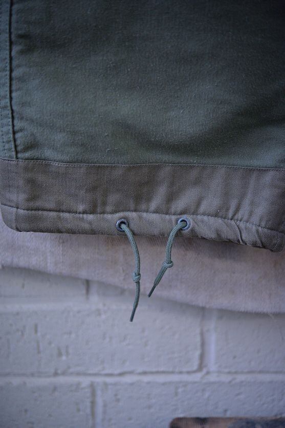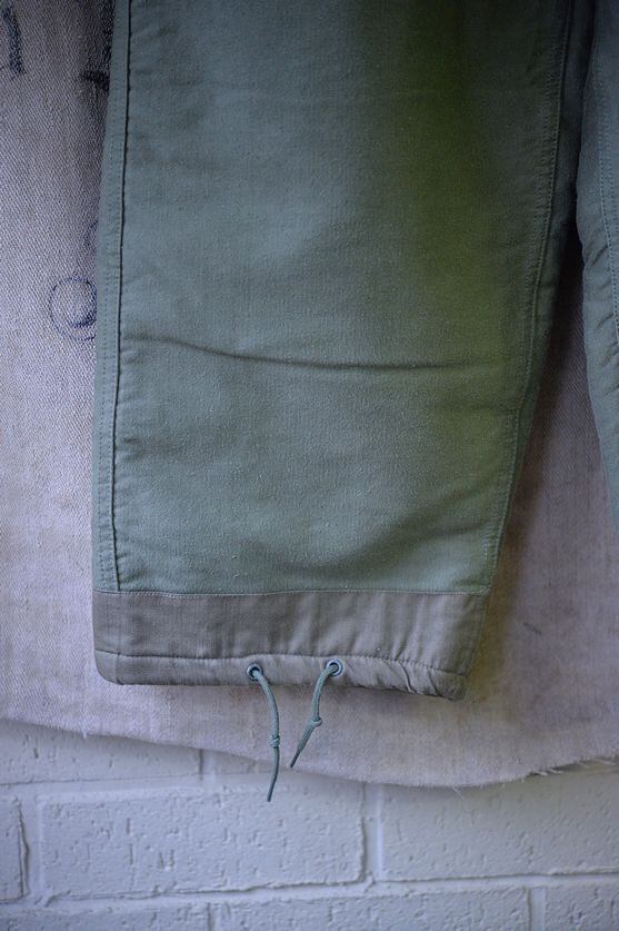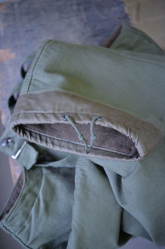 The material is cotton and thick. The color is olive green. A government-issued label is also attached. This model has two flap pockets on the front. The lining is made of wool with a good texture on the back. It also has a more classical feel than later models. The zipper is a French zipper. There is an adjuster on the hem, and this specification is the same as the US Navy's N-1 jacket trousers.