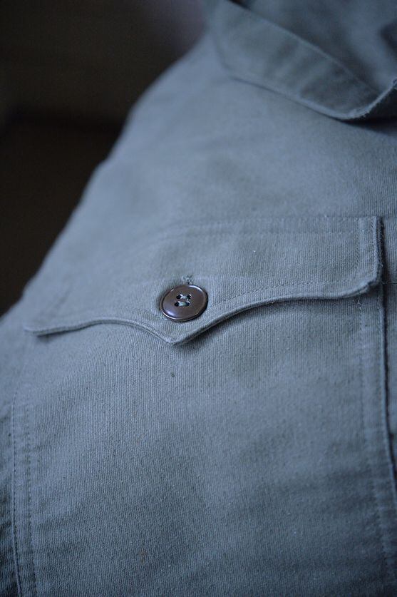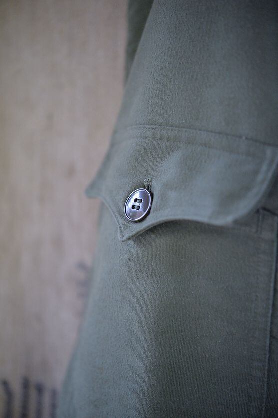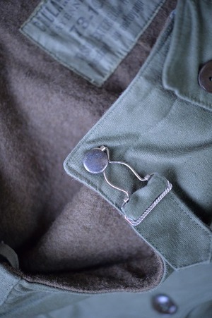 マテリアルはコットンで厚手のもの。カラーはオリーブグリーン。官給品のラベルも取り付けられています。フロントに2つのフラップ付きポケットがあるモデル。 ライニングはウールの風合いの良いものが裏面に張られています。こちらも後年のモデルよりも風合いが感じられる クラシカルな雰囲気がございます。