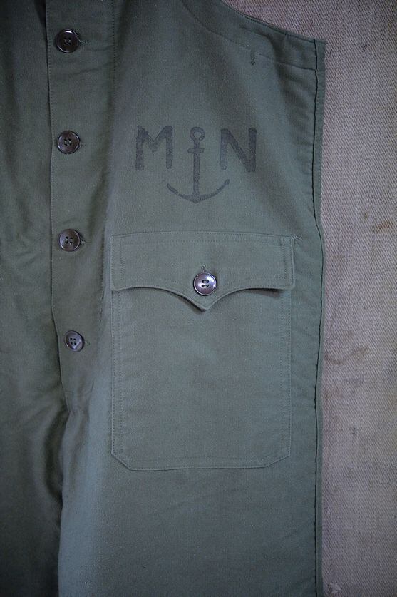 1940年代以降の米海軍N-1システムからデザイン・技術供与を受けて開発生産されたと思われる、 フランス海軍のウインタージャケット用トラウザース。米海軍のN-1デッキジャケット用トラウザースの形状を踏襲しています。このデザインのウインタージャケットシステムはフランス海軍においても、1950年代から仕様変更を受けながら1970年代まで継続し採用されました。