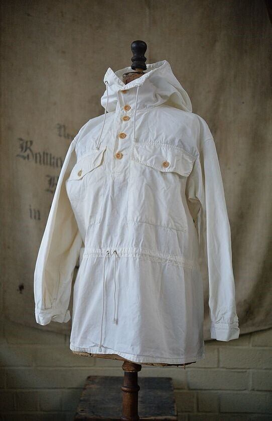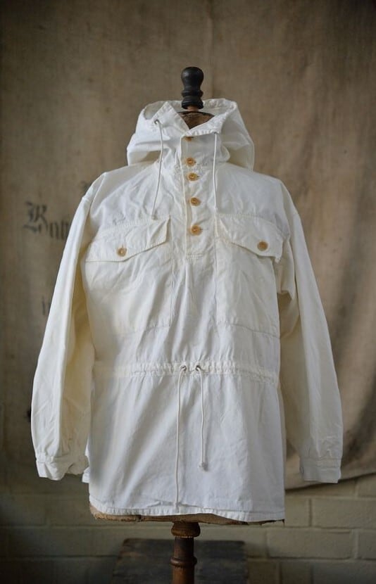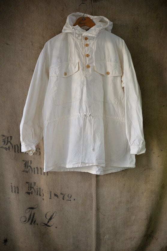 フードとウエストにドローコードがあり、脇下にはベンチレーションのアイレットがあります。ミディアムのサイズ表示は内部にスタンプで押されています。