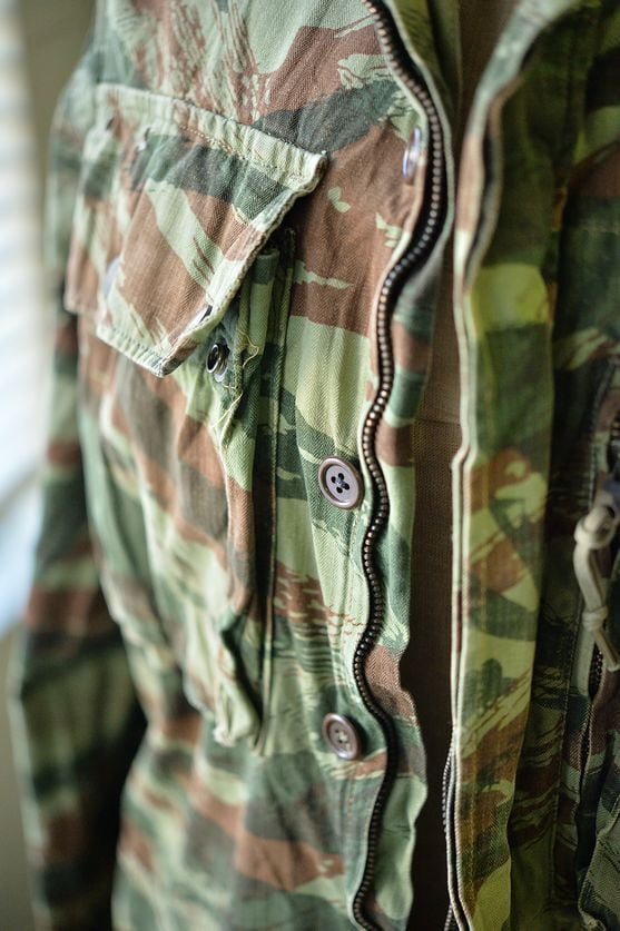 フランス軍 インドシナ戦争頃から使用されたリザードカモフラージュ生地のフィールドジャケット。オリーブグリーンのカラーも存在します。フロントはジッパーとボタンによる開閉。スタンドカラー。裾にドローコードがあります。