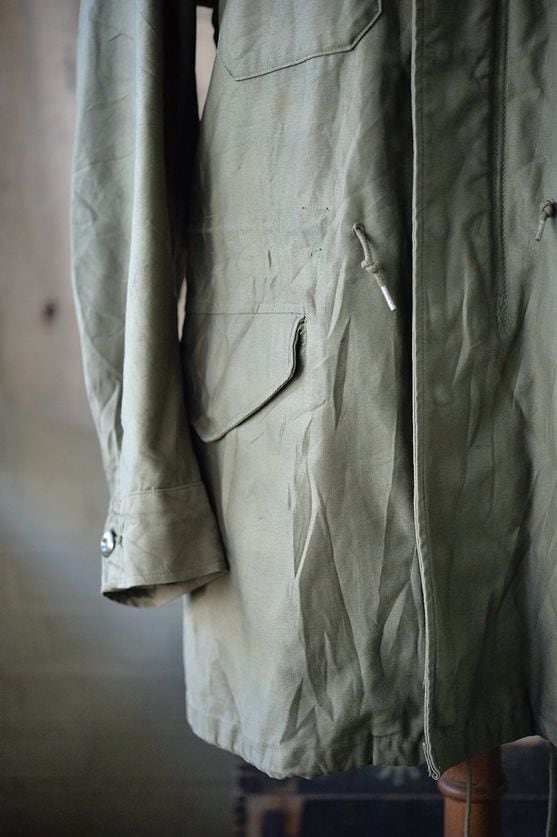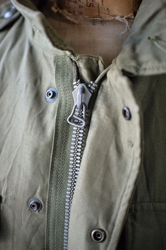 1963年や1964年発注のM-1951フィールドジャケットにみられる、小型の襟、オリーブグリーンの生地、ファティーグ同型の艶のあるラウンドボタンが使われています。