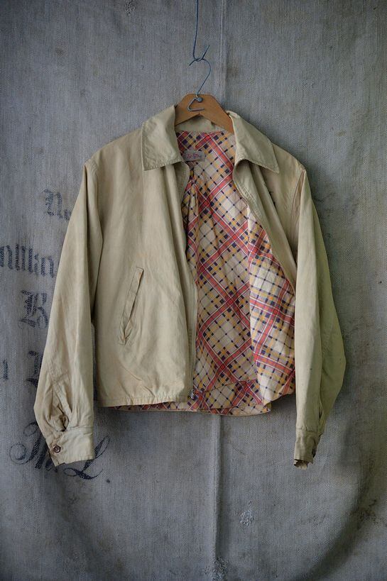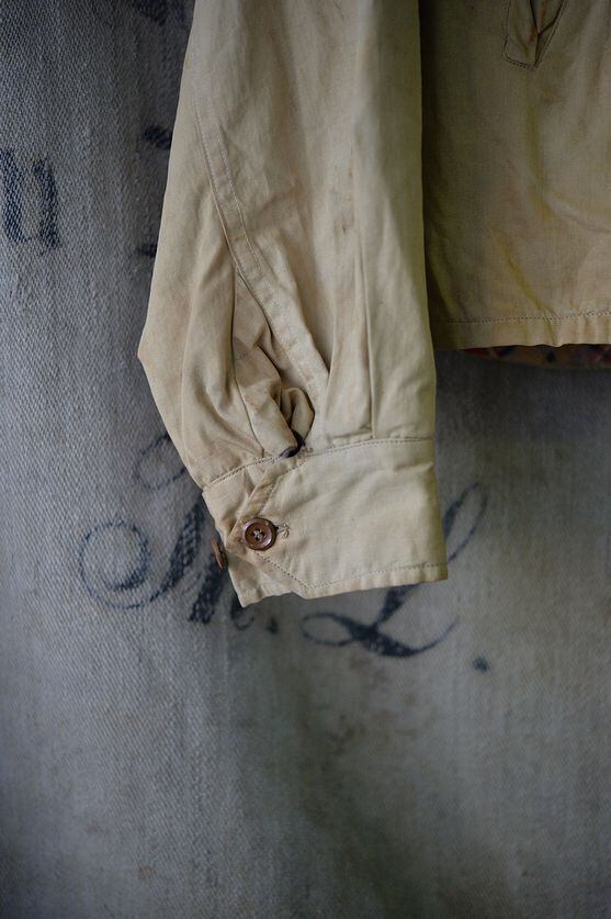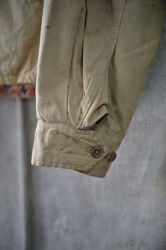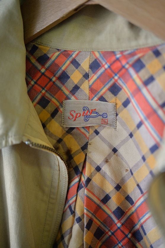 マテリアルはコットンで薄手です。ライニングはチェック柄。バックヨークとセンタープリーツがあります。サイズアジャスター付き。