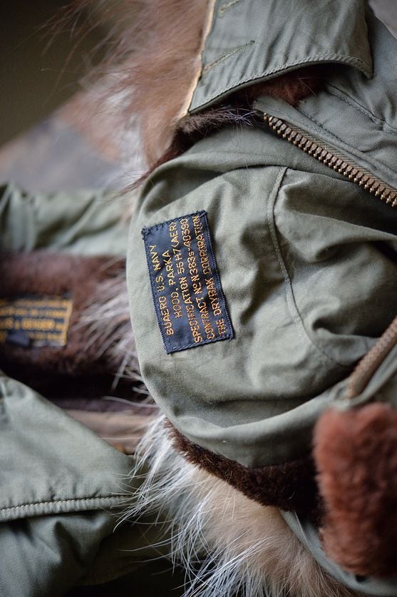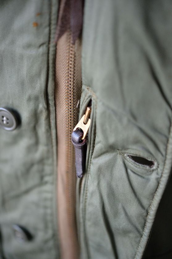 コットンマテリアル、アルパカライニング、フロントはジッパーとボタンで開閉。ジッパーはTALON。マフポケットの内部にリブニットが取り付けられるなど機能性の高い名作です。