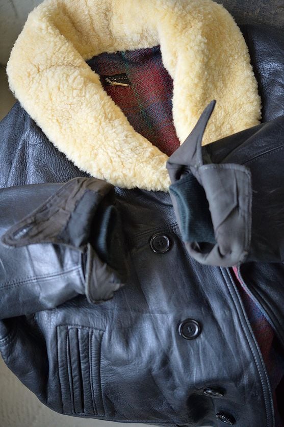ブラックフィニッシュ、シングルブレスト、ウールライニング、カフス仕様の袖。肉厚のホースレザーを使用した人気の高いヴィンテージレザーコート。