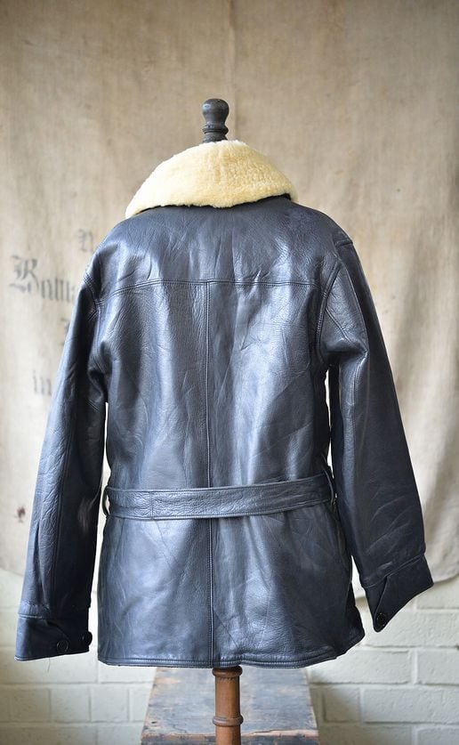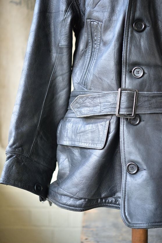 Black finish, single breasted, wool lining and cuffed sleeves. A popular vintage leather coat made from thick horse leather.