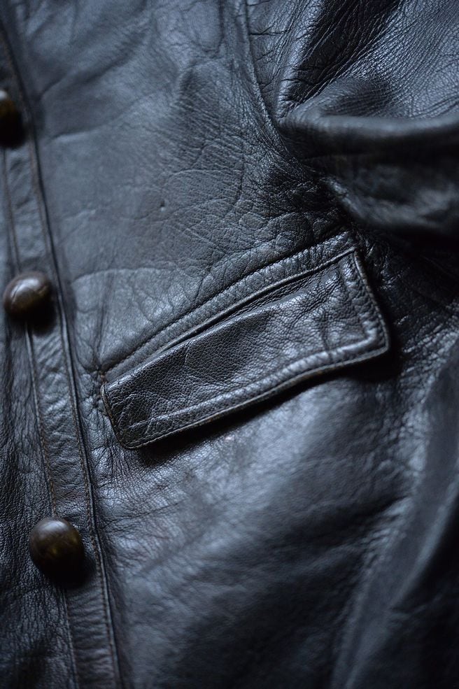 このスタイルのワークジャケットに使用されるレザーは多くがゴートスキンですが、このジャケットもGetskinn、ゴートスキンレザーが使用されています。レザーコンディションは非常に柔らかな質感になっています。ポケットフラップなどは保管に伴って折れ目がありますが、レザーの強度に全く問題はありません。