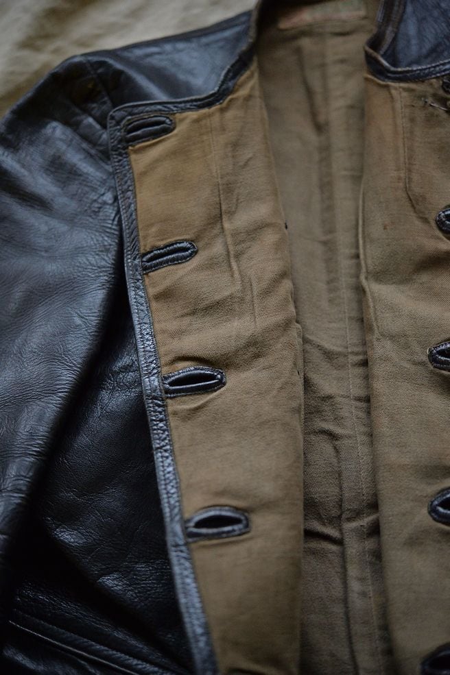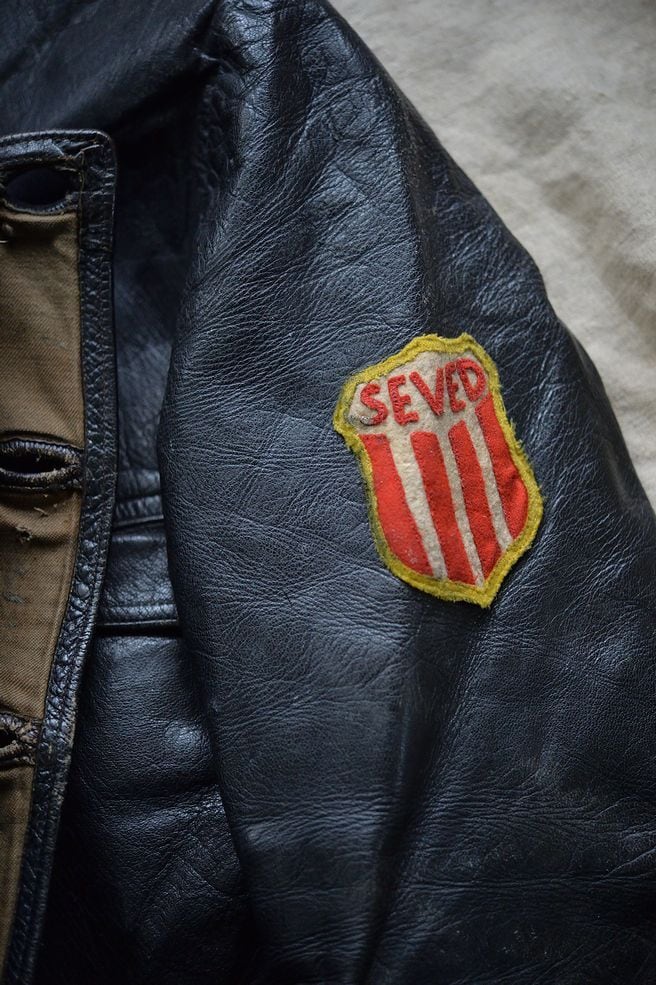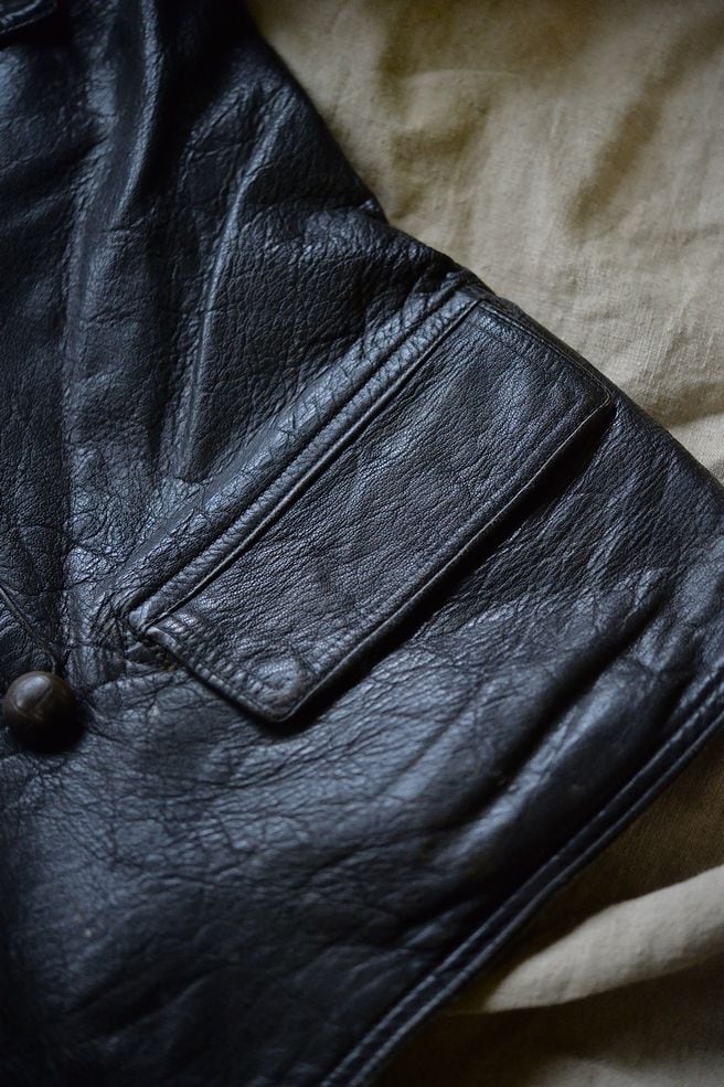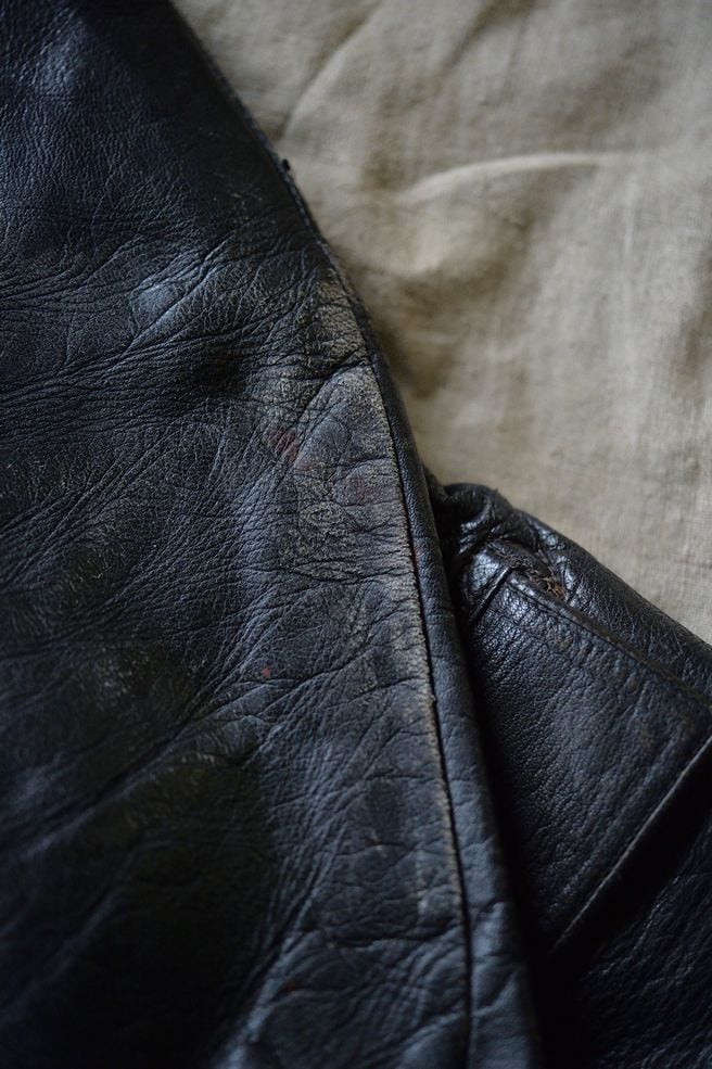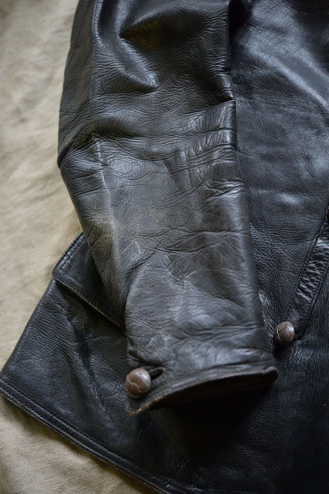 レザーカラーはブラックカラーフィニッシュが施されています。ライニングは古い時代に見られるベージュ色のコットンライニング。左袖には当時のパッチが取り付けられています。公共機関なのか軍用なのか不明です。