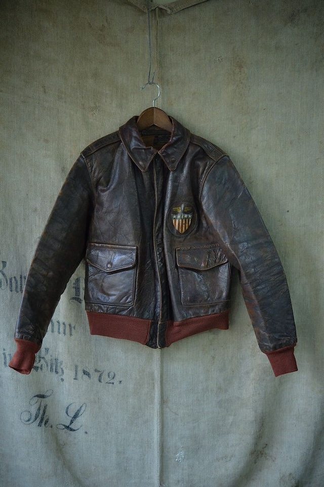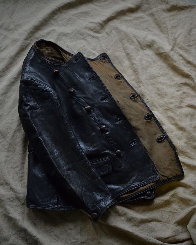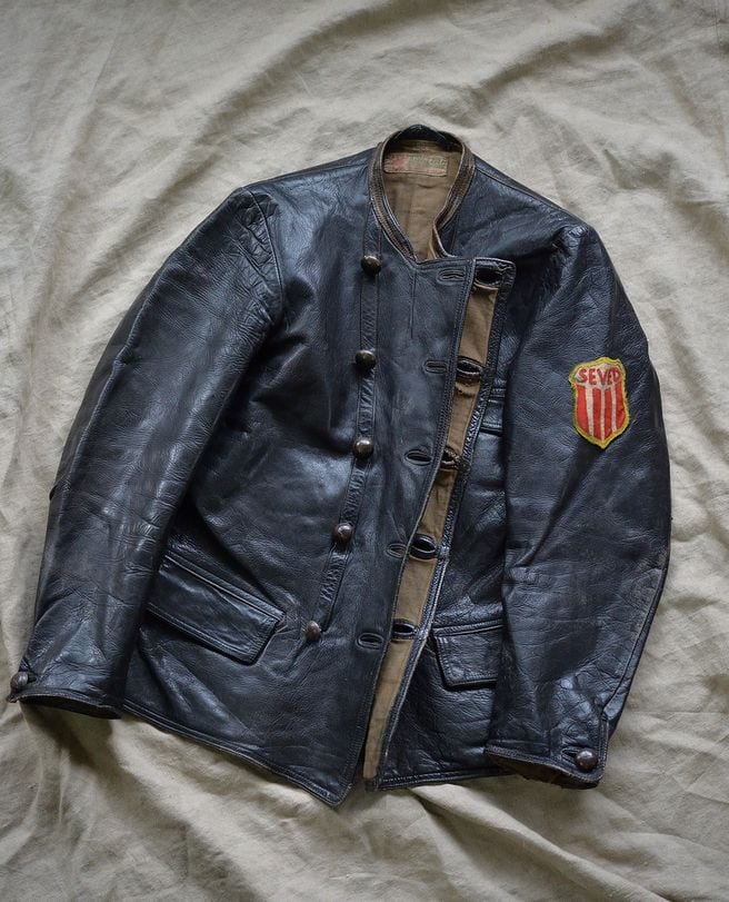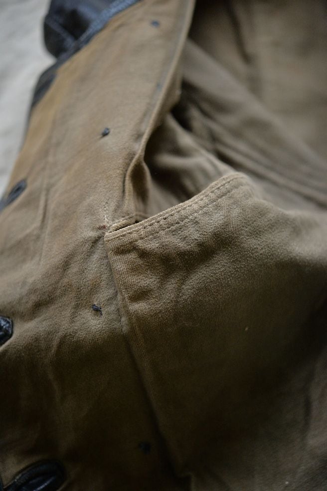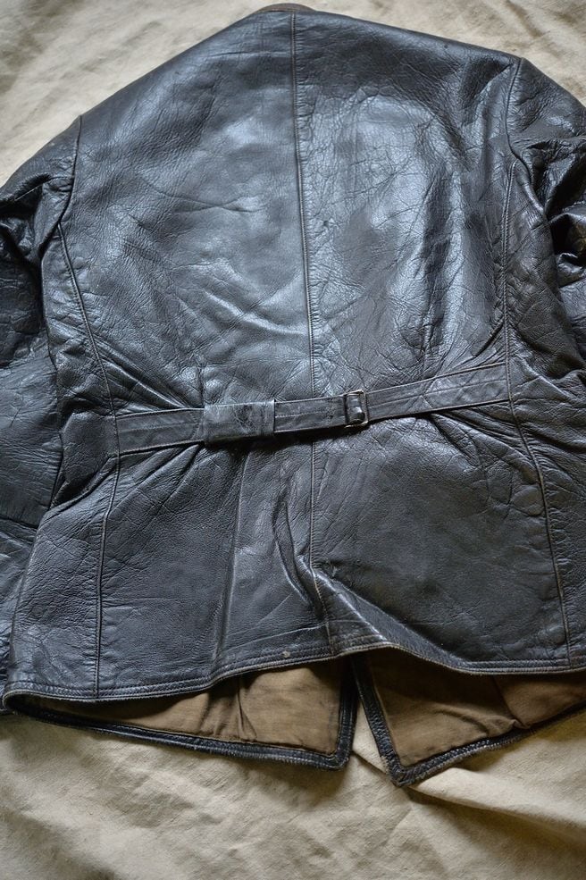 レザーカラーはブラックカラーフィニッシュが施されています。ライニングは古い時代に見られるベージュ色のコットンライニング。左袖には当時のパッチが取り付けられています。公共機関なのか軍用なのか不明です。